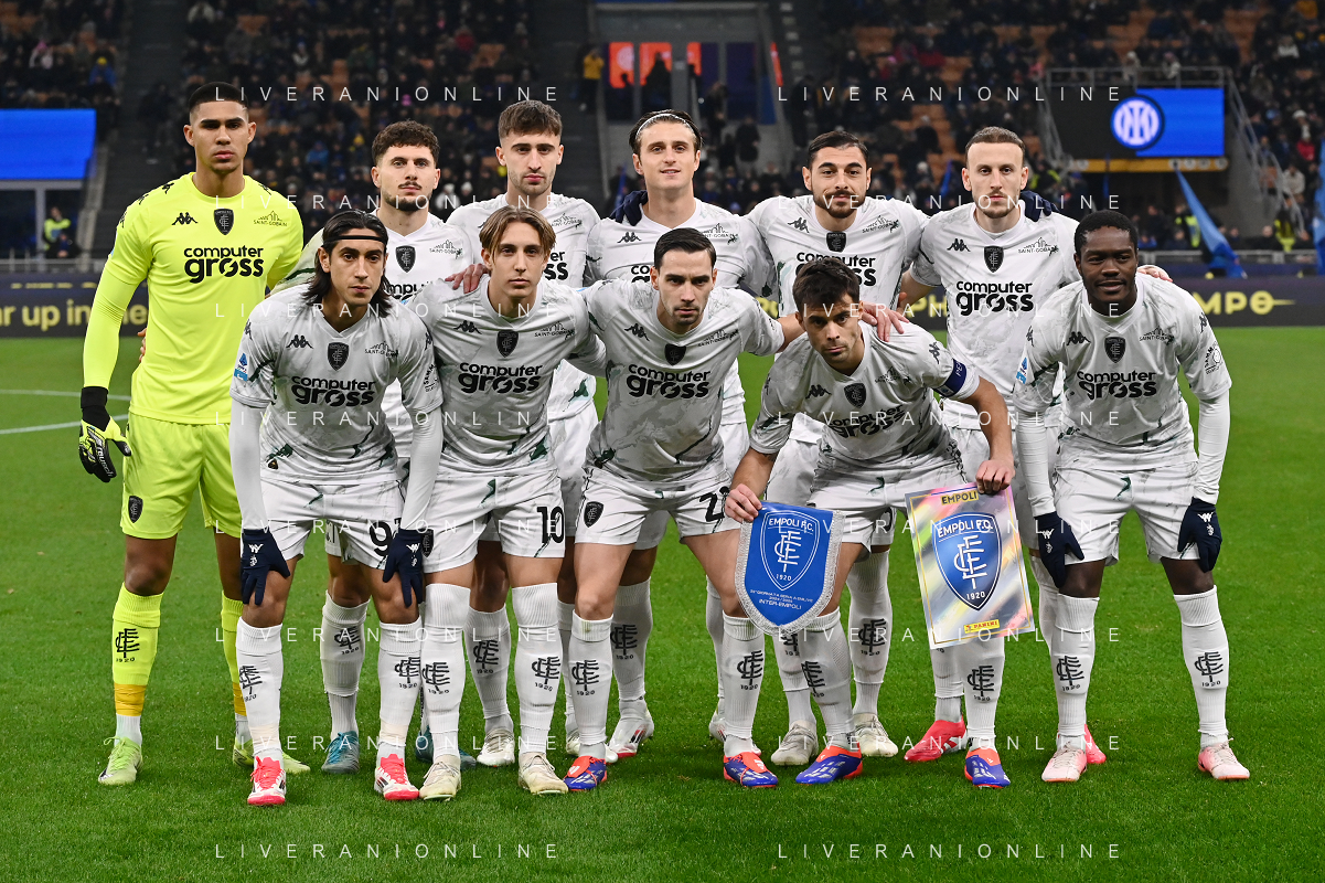 Inter vs Empoli nella foto formazione Empoli, in piedi da SX Devis Vasquez, Liberato Cacace, Mattia Viti, Lorenzo Colombo, Giuseppe Pezzella e Ardian Ismajli; in basso da SX Youssef Maleh, Jacopo Fazzini, Mattia De Sciglio, Alberto Grassi e Emmanuel Gyasi Milano 19-01-2025 Stadio Giuseppe Meazza - San Siro Campionato Serie A Enilive - 21a giornata foto Roberto Garavaglia/Agenzia Aldo Liverani sas