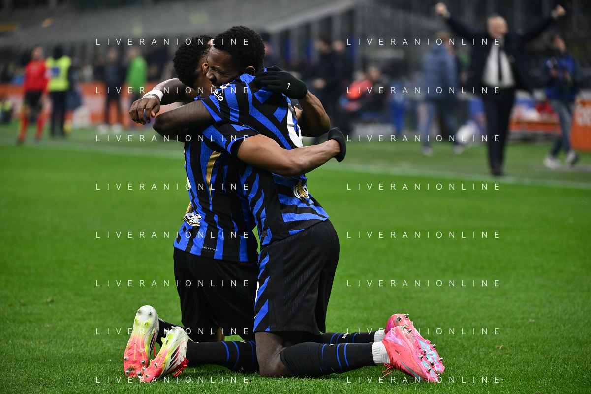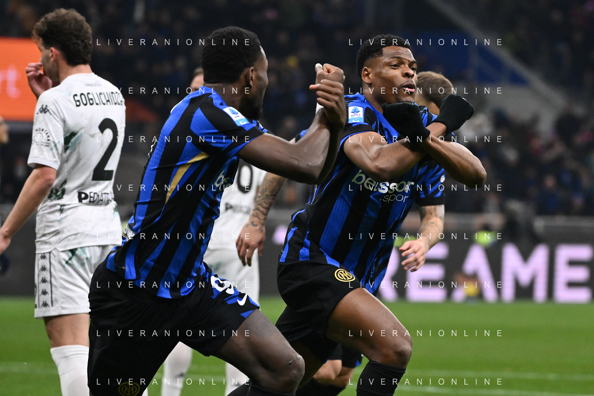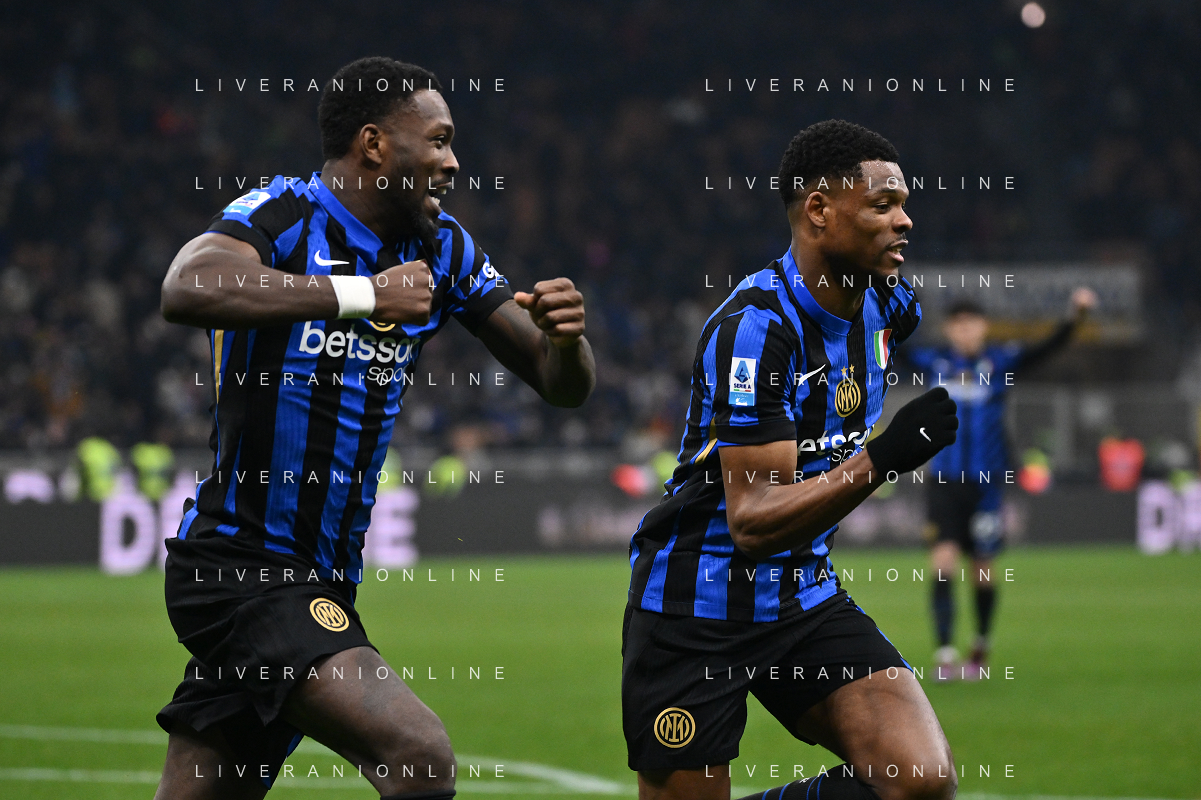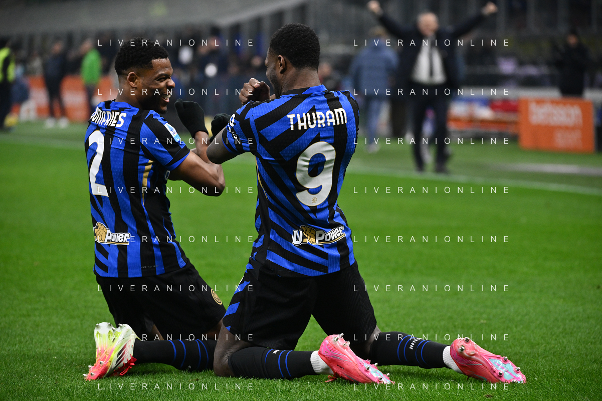 Inter vs Empoli nella foto Denzel Dumfries (Inter) e Marcus Thuram (Inter) esultanza dopo il gol dell'1 a 0 Milano 19-01-2025 Stadio Giuseppe Meazza - San Siro Campionato Serie A Enilive - 21a giornata foto Roberto Garavaglia/Agenzia Aldo Liverani sas - AGENZIA ALDO LIVERANI SAS