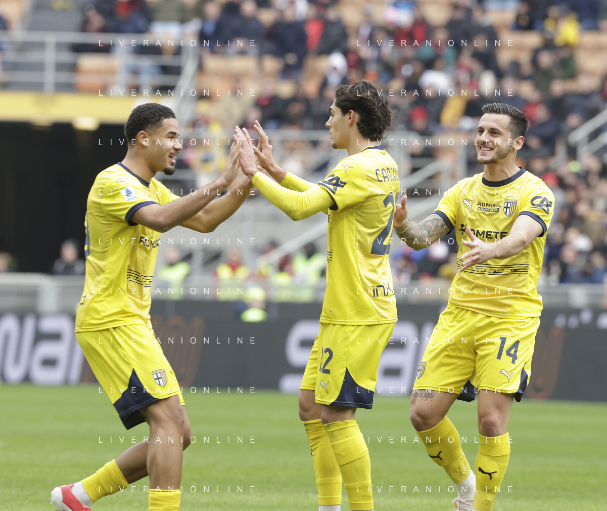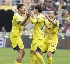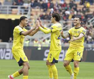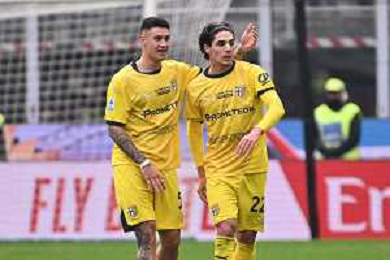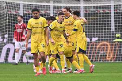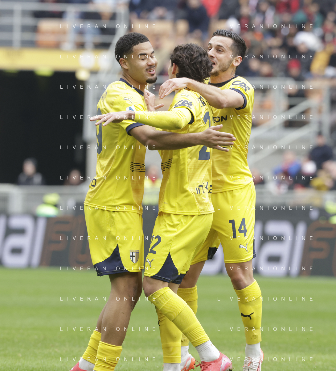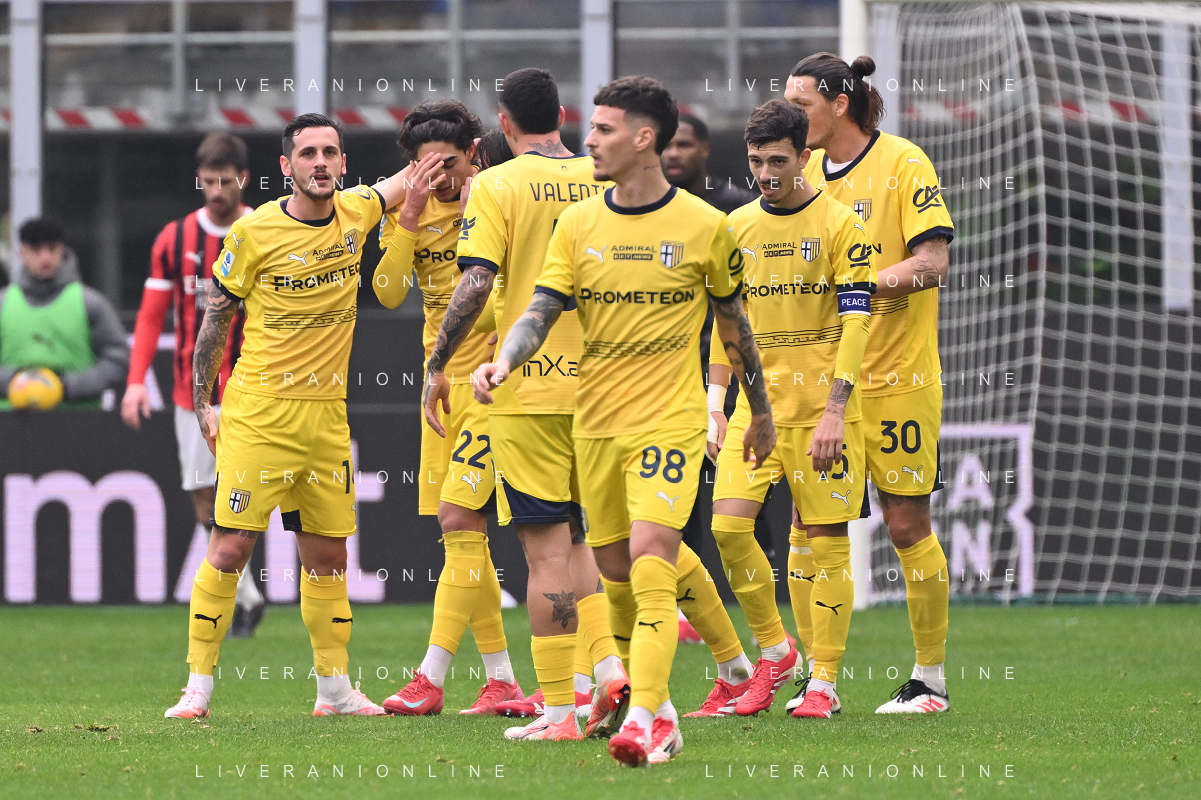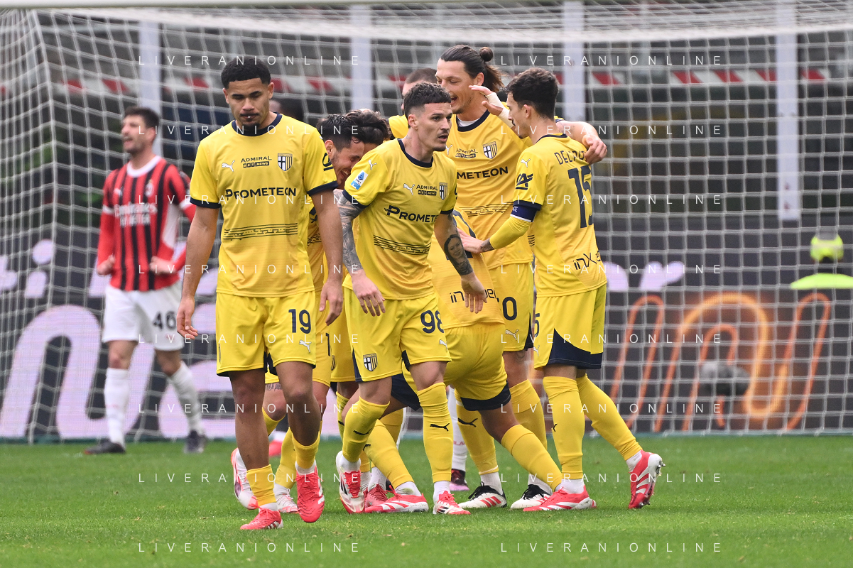 Milan vs Parma nella foto giocatori Parma esultanza dopo il gol dell'1 a 0 Milano 26-01-2025 Stadio Giuseppe Meazza - San Siro Campionato Serie A Enilive - 22a giornata foto Roberto Garavaglia/Agenzia Aldo Liverani sas- AGENZIA ALDO LIVERANI SAS