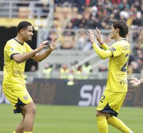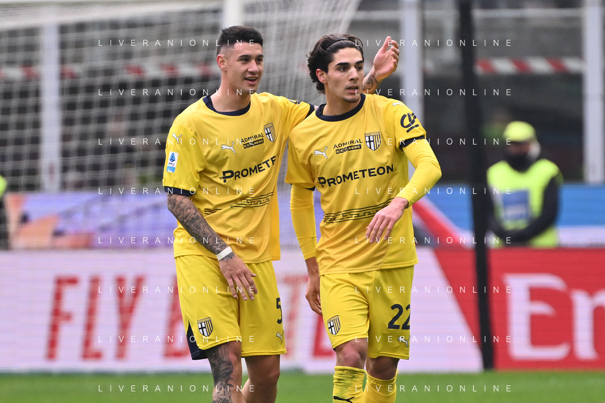 Milan vs Parma nella foto Lautaro Rodrigo Valenti (Parma) e Matteo Cancellieri (Parma) esultanza dopo il gol dell'1 a 0 Milano 26-01-2025 Stadio Giuseppe Meazza - San Siro Campionato Serie A Enilive - 22a giornata foto Roberto Garavaglia/Agenzia Aldo Liverani sas- AGENZIA ALDO LIVERANI SAS