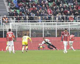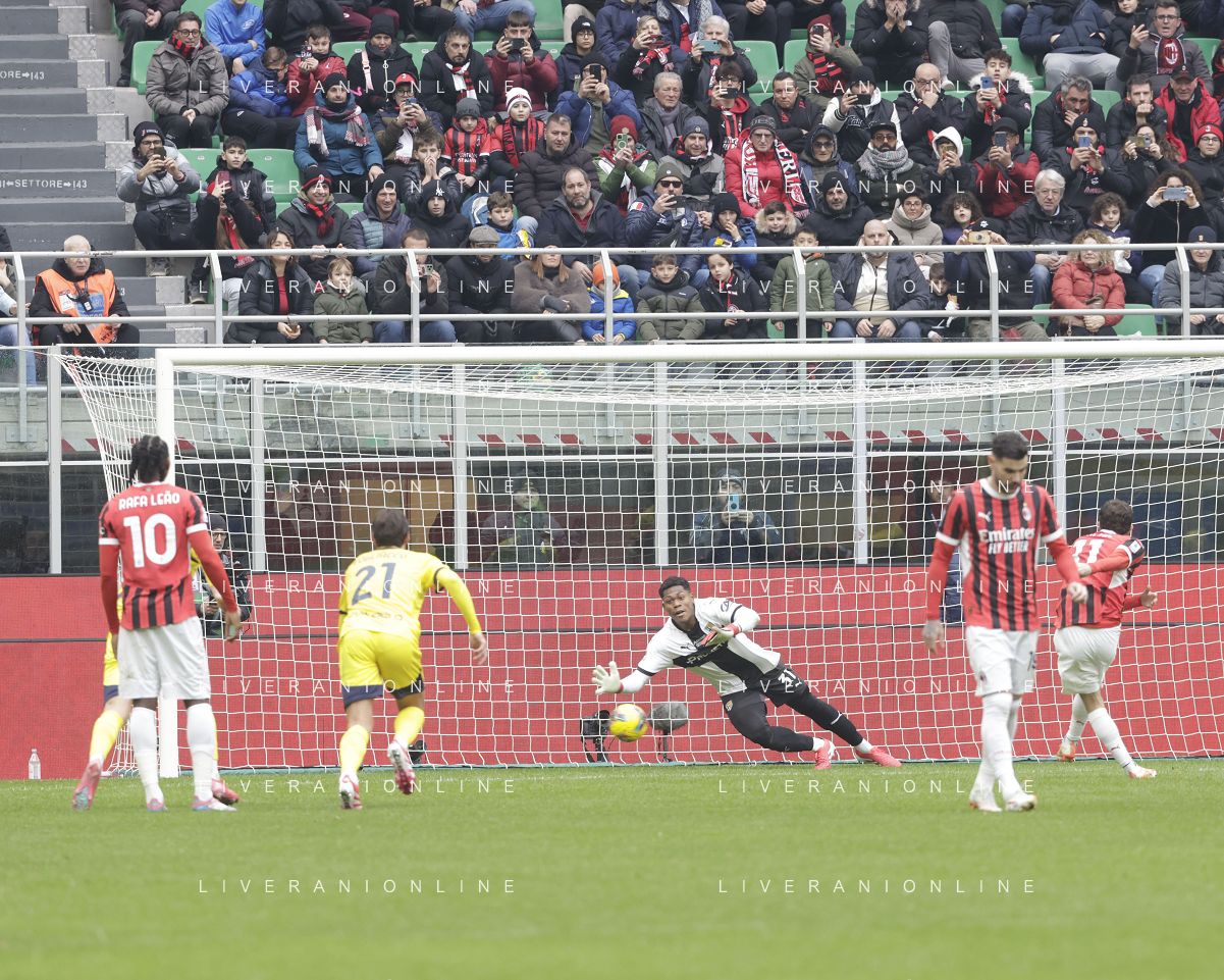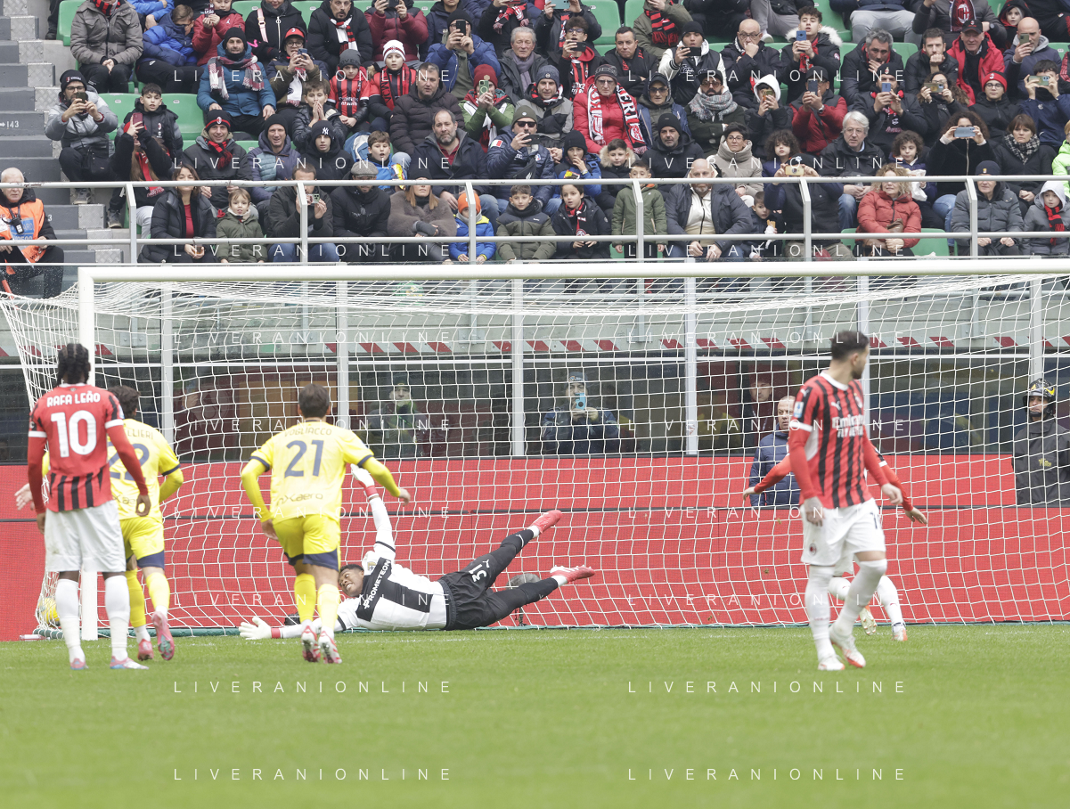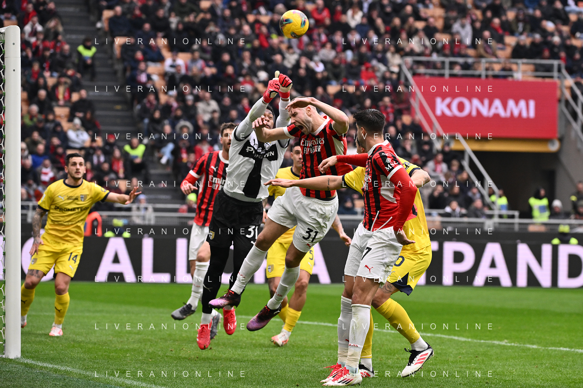 Milan vs Parma nella foto Zion Suzuki (Parma) fallo da rigore su Strahinja Pavlovic (Milan) Milano 26-01-2025 Stadio Giuseppe Meazza - San Siro Campionato Serie A Enilive - 22a giornata foto Roberto Garavaglia/Agenzia Aldo Liverani sas- AGENZIA ALDO LIVERANI SAS