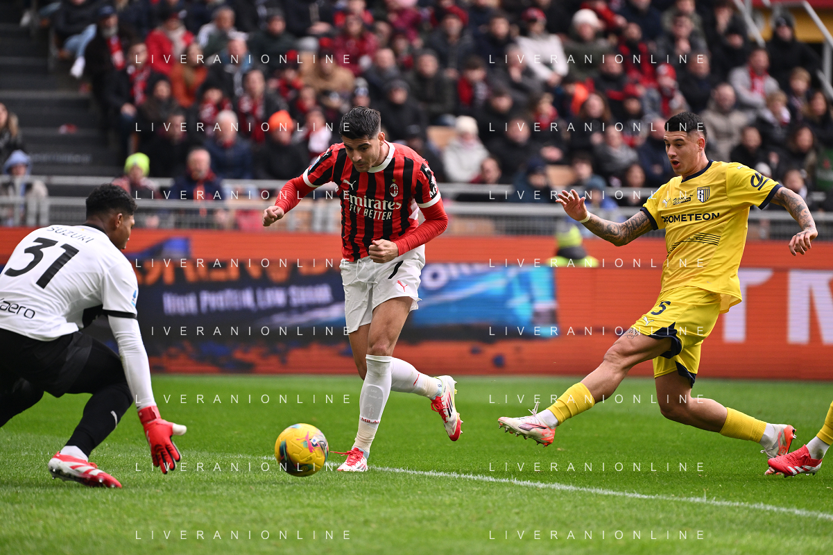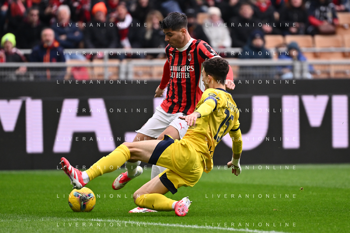 Milan vs Parma nella foto Alvaro Morata (Milan) e Enrico Delprato (Parma) Milano 26-01-2025 Stadio Giuseppe Meazza - San Siro Campionato Serie A Enilive - 22a giornata foto Roberto Garavaglia/Agenzia Aldo Liverani sas- AGENZIA ALDO LIVERANI SAS