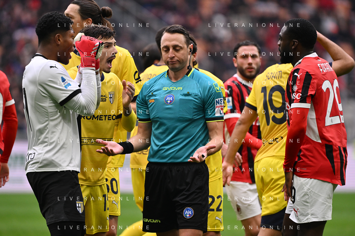 Milan vs Parma nella foto proteste Parma con l'arbitro Rosario Abisso di Palermo Milano 26-01-2025 Stadio Giuseppe Meazza - San Siro Campionato Serie A Enilive - 22a giornata foto Roberto Garavaglia/Agenzia Aldo Liverani sas- AGENZIA ALDO LIVERANI SAS