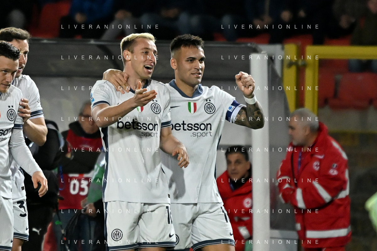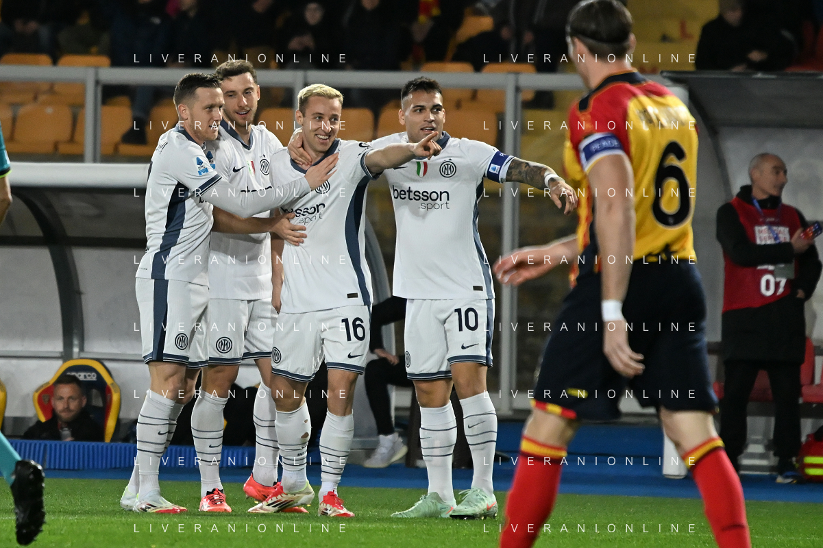 TVEM January 26, 2025 Lecce, Italy - US Lecce vs FC Inter - Italian soccer serie A 2024/25 - Via Del Mare Stadium. In the pic: Davide Frattesi of FC Inter celebrates after scoring a goal with teammates FOTO EMMANUELE MASTRODONATO-AG ALDO LIVERANI SAS