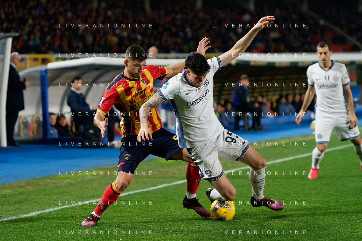 TVEM January 26, 2025 Lecce, Italy - US Lecce vs FC Inter - Italian soccer serie A 2024/25 - Via Del Mare Stadium. In the pic: Santiago Pierotti of US Lecce in action against Alessandro Bastoni of FC Inter FOTO EMMANUELE MASTRODONATO-AG ALDO LIVERANI SAS