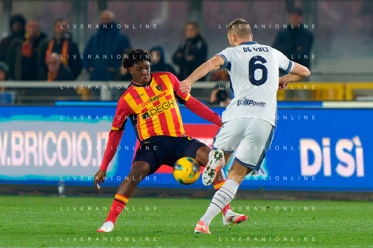 TVEM January 26, 2025 Lecce, Italy - US Lecce vs FC Inter - Italian soccer serie A 2024/25 - Via Del Mare Stadium. In the pic: Patrick Dorgu of US Lecce in action against Stefan de Vrij of FC Inter FOTO EMMANUELE MASTRODONATO-AG ALDO LIVERANI SAS