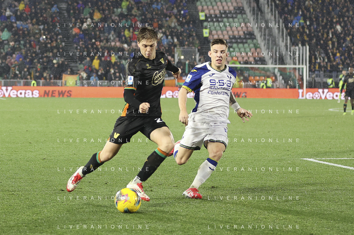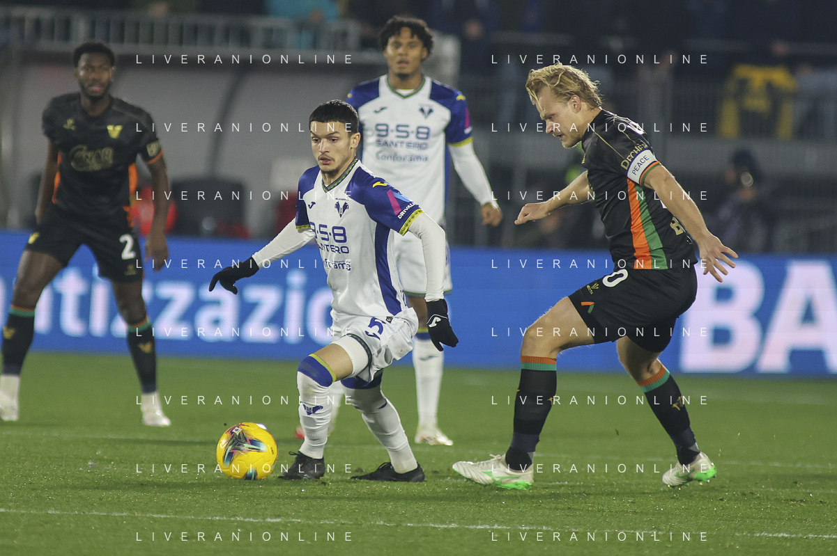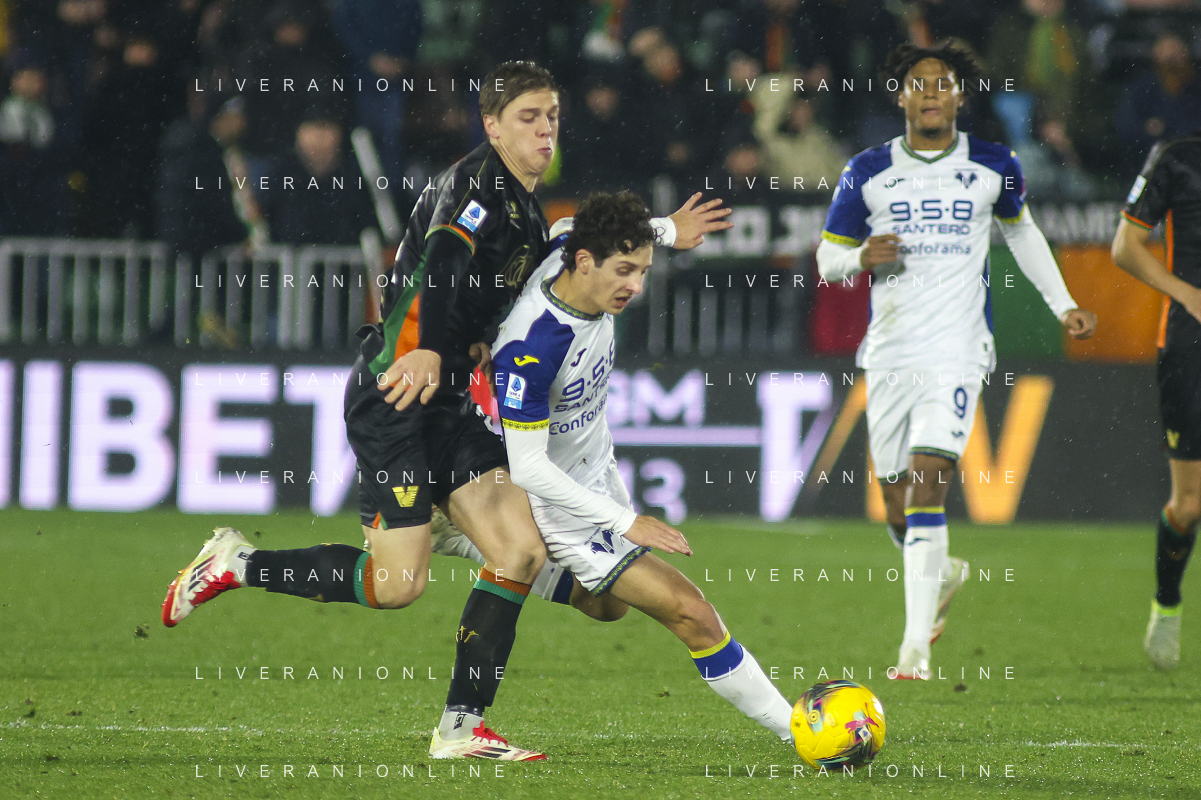 Domagoj Bradaric of Hellas Verona FC competes for the ball with Alessio Zerbin of Venezia FC during Venezia FC vs Hellas Verona FC, 22° Serie A Enilive 2024-25 game at Pier Luigi Penzo stadium in Venezia (VE), Italy, on January 27, 2025. (Photo by Davide Casentini) AG ALDO LIVERANI SAS