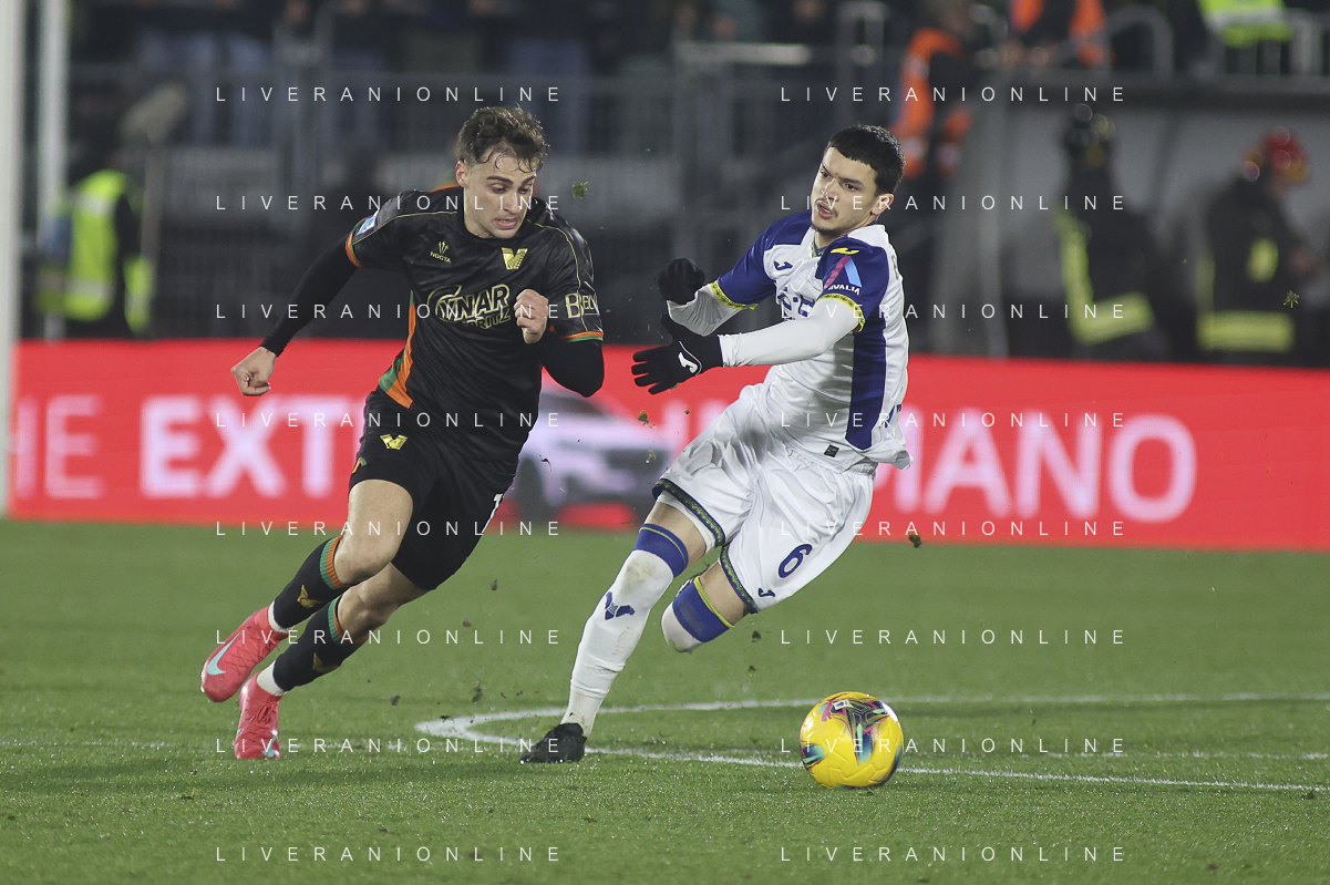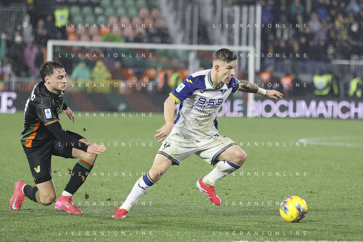 Gaetano Oristanio of Venezia FC battle for the ball with Reda Belahyane of Hellas Verona FC during Venezia FC vs Hellas Verona FC, 22° Serie A Enilive 2024-25 game at Pier Luigi Penzo stadium in Venezia (VE), Italy, on January 27, 2025. (Photo by Davide Casentini)- AGENZIA ALDO LIVERANI SAS