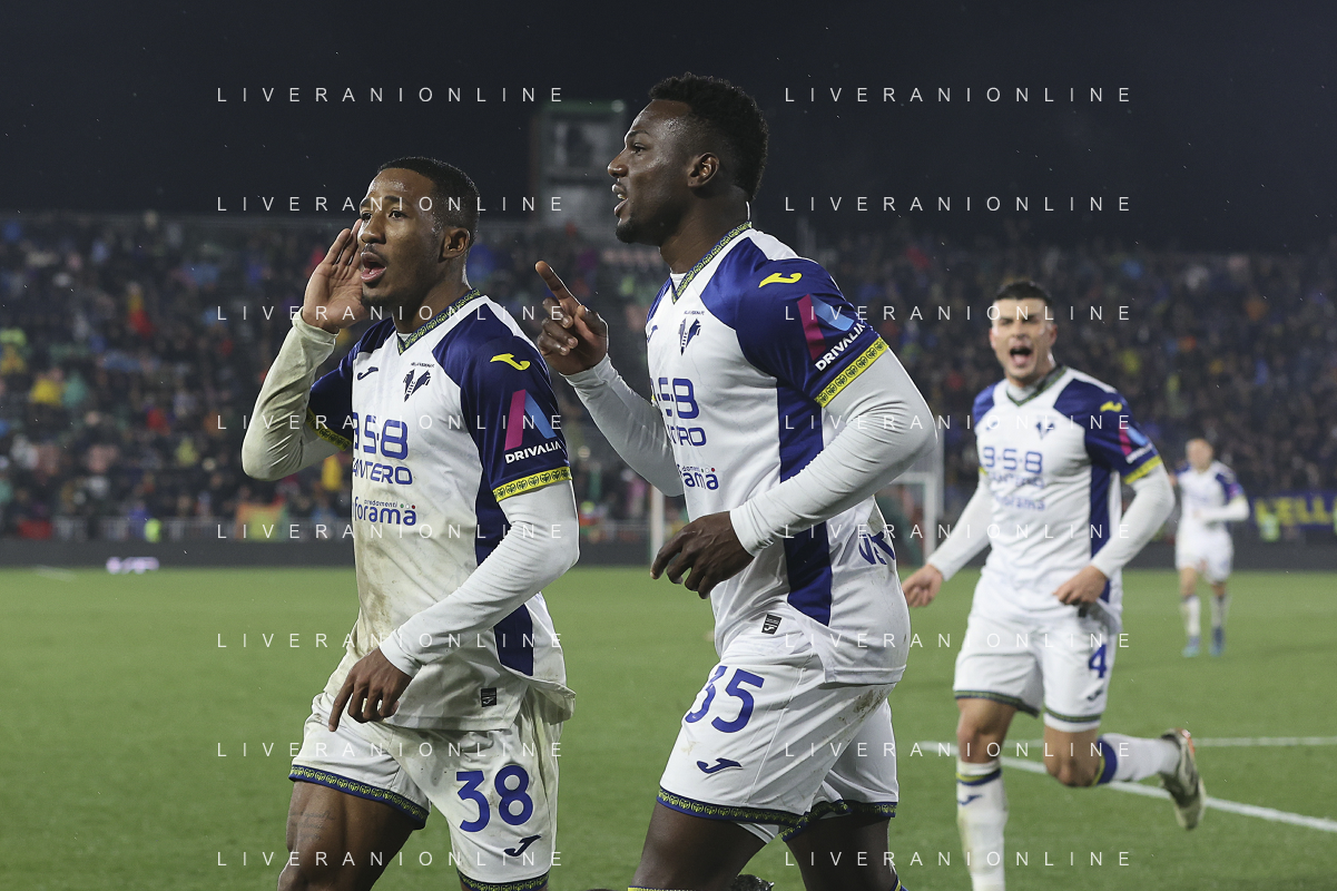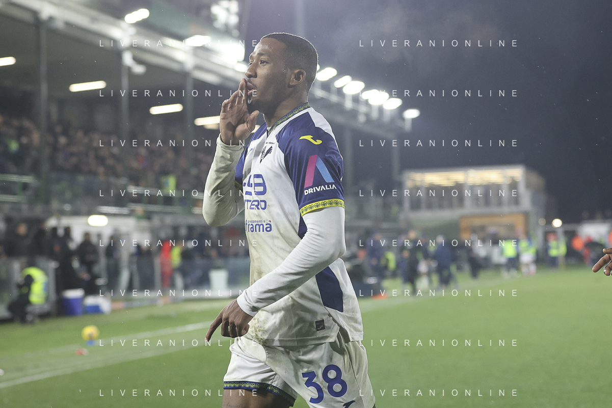 Jackson Tchatchoua of Hellas Verona FC celebrates after scoring goal during Venezia FC vs Hellas Verona FC, 22° Serie A Enilive 2024-25 game at Pier Luigi Penzo stadium in Venezia (VE), Italy, on January 27, 2025. (Photo by Davide Casentini)- AGENZIA ALDO LIVERANI SAS