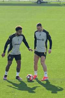 TVMV-Torino 28.01.2025 Continassa © Manuela Viganti/Agenzia Aldo Liverani Allenamento Juventus Rifinitura partita Champions League Juventus vs Benfica Nella foto: weston mckennie e teun koopmeiners ©Viganti- AGENZIA ALDO LIVERANI SAS