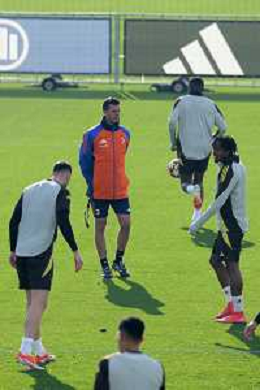 TVMV-Torino 28.01.2025 Continassa © Manuela Viganti/Agenzia Aldo Liverani Allenamento Juventus Rifinitura partita Champions League Juventus vs Benfica Nella foto: il gruppo juventus scherza durante l’allenamento ©Viganti- AGENZIA ALDO LIVERANI SAS