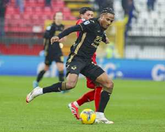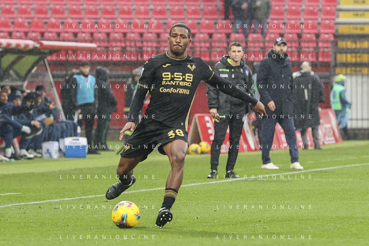 Amin Sarr of Hellas Verona FC play the ball during AC Monza vs Hellas Verona FC, 23° Serie A Enilive 2024-25 game at U-Power stadium in Monza (MB), Italy, on February 01, 2025. (Photo by Davide Casentini)- AGENZIA ALDO LIVERANI SAS