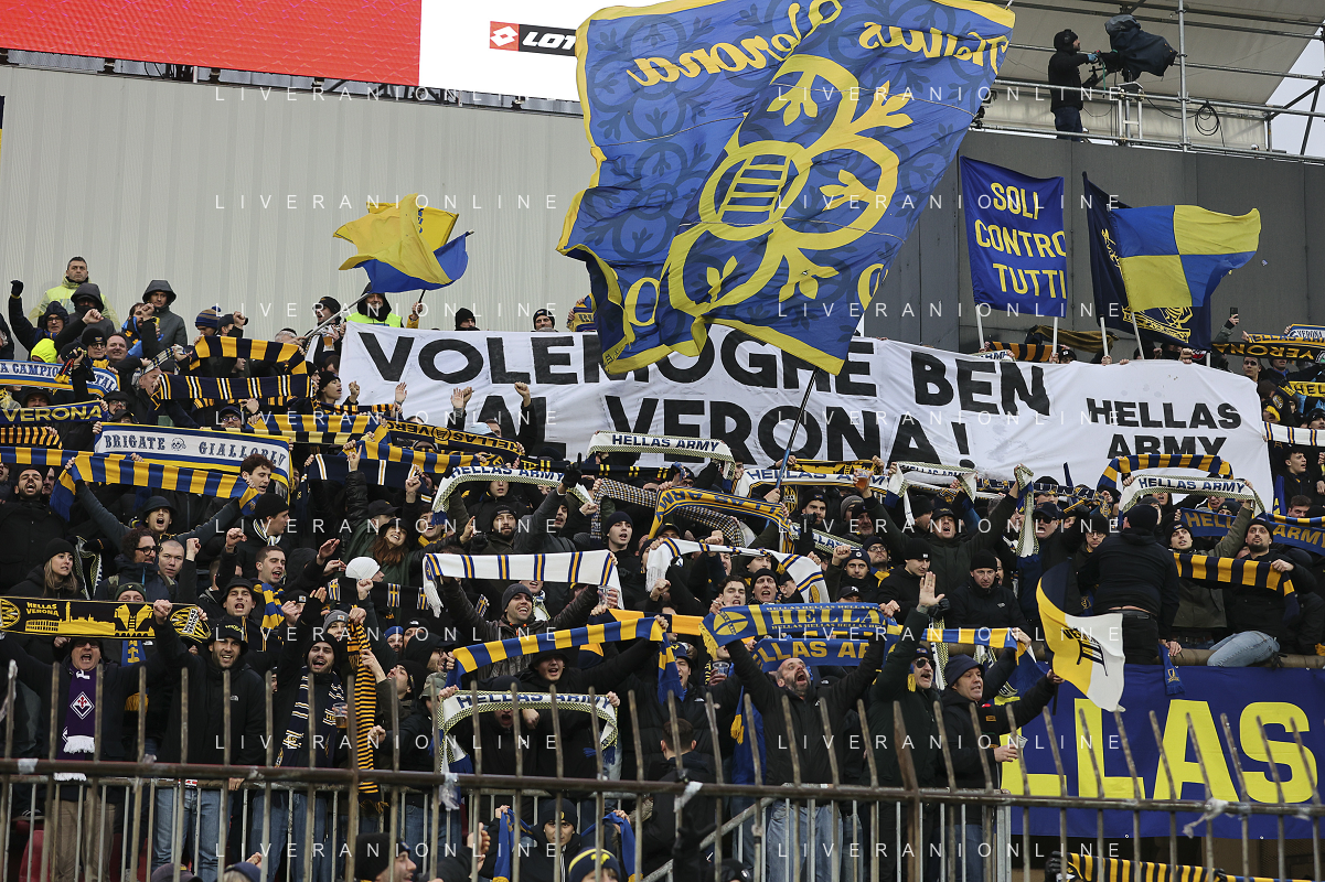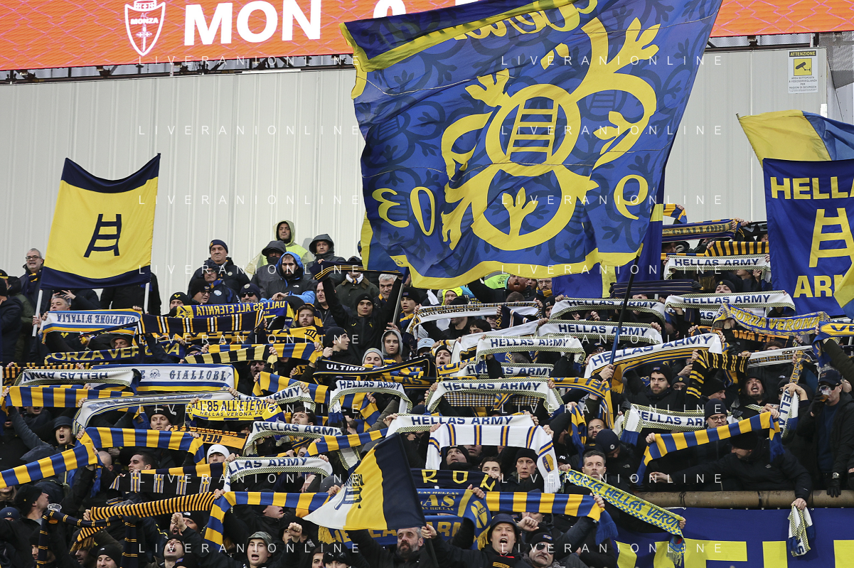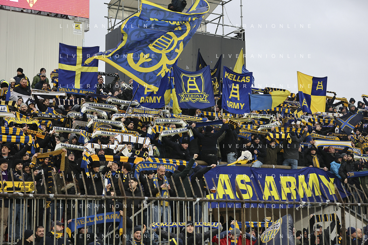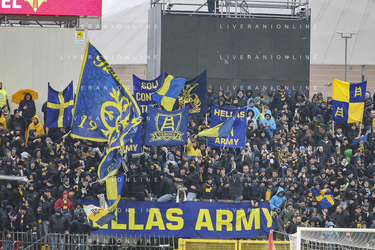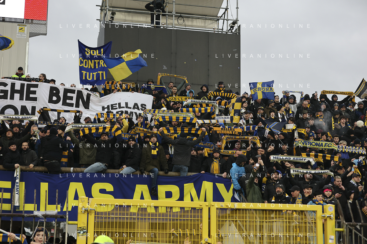 tifosi - Hellas Verona fans show their support during AC Monza vs Hellas Verona FC, 23° Serie A Enilive 2024-25 game at U-Power stadium in Monza (MB), Italy, on February 01, 2025. (Photo by Davide Casentini)- AGENZIA ALDO LIVERANI SAS