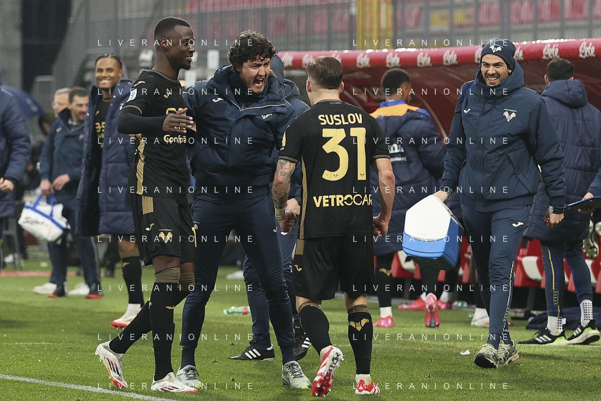 Cheikh Niasse of Hellas Verona FC and Tomas Suslov of Hellas Verona FC celebrate the victory at the end of AC Monza vs Hellas Verona FC, 23° Serie A Enilive 2024-25 game at U-Power stadium in Monza (MB), Italy, on February 01, 2025. (Photo by Davide Casentini)- AGENZIA ALDO LIVERANI SAS