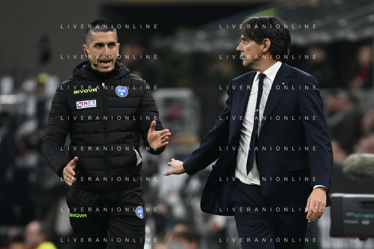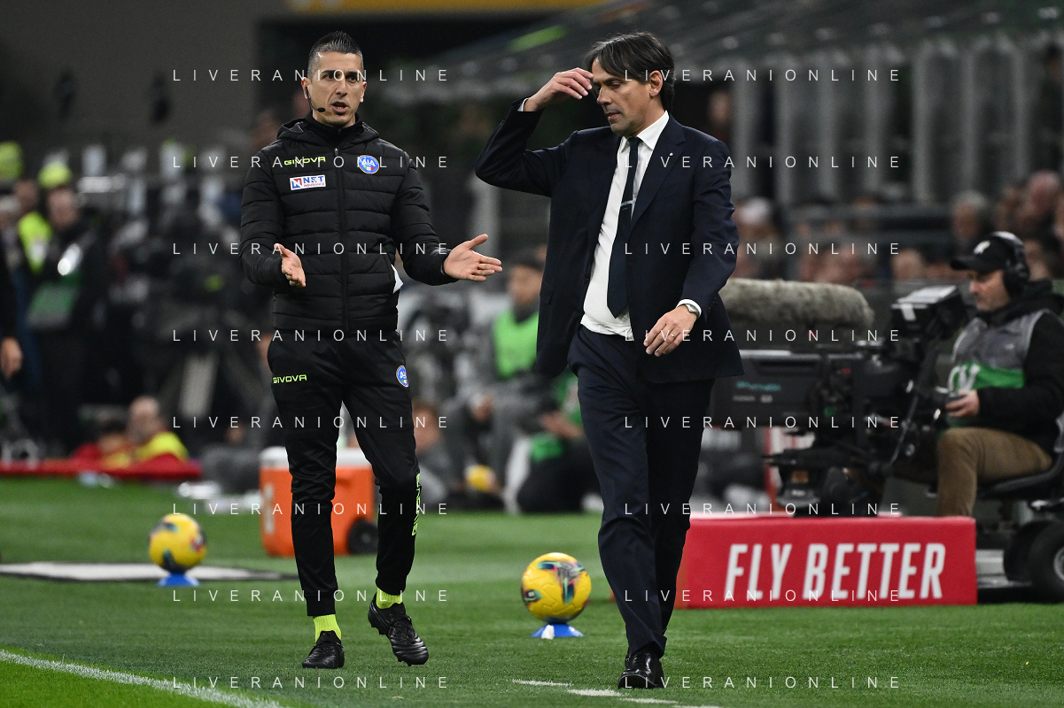 Milan vs Inter nella foto l'arbitro Livio Marinelli di Tivoli (Roma) SX, quarto ufficiale di gara, discute con Simone Inzaghi allenatore Inter DX Milano 02-02-2025 Stadio Giuseppe Meazza - San Siro Campionato Serie A Enilive - 23a giornata foto Roberto Garavaglia/Agenzia Aldo Liverani sas