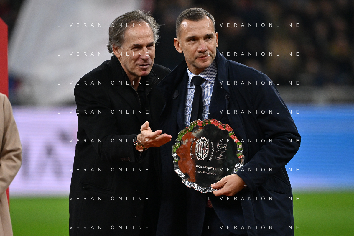 Milan vs Inter nella foto Andriy Shevchenko SX premiato prima della gara da Franco Baresi vicepresidente onorario Milan DX Milano 02-02-2025 Stadio Giuseppe Meazza - San Siro Campionato Serie A Enilive - 23a giornata foto Roberto Garavaglia/Agenzia Aldo Liverani sas