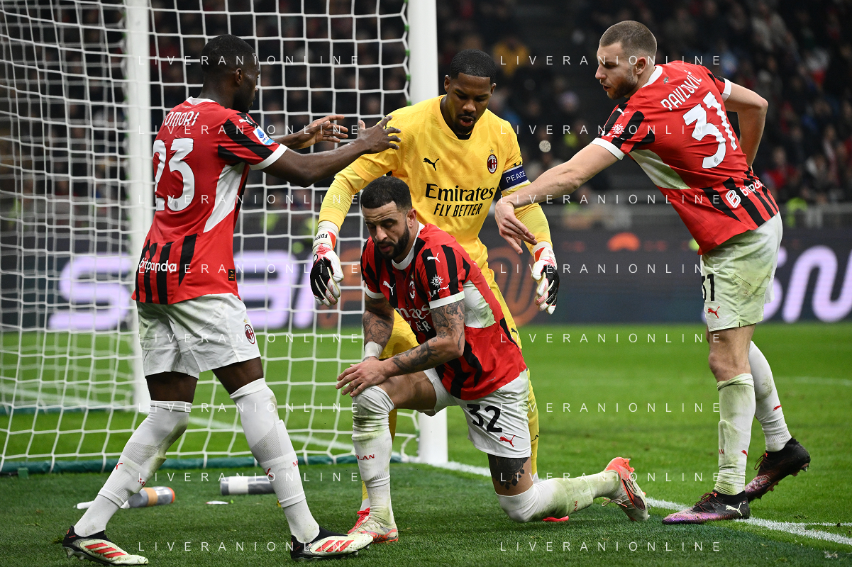 Milan vs Inter nella foto la difesa del Milan , da SX Fikayo Tomori (Milan), Kyle Walker (Milan), Mike Maignan (Milan) e Strahinja Pavlovic (Milan) Milano 02-02-2025 Stadio Giuseppe Meazza - San Siro Campionato Serie A Enilive - 23a giornata foto Roberto Garavaglia/Agenzia Aldo Liverani sas