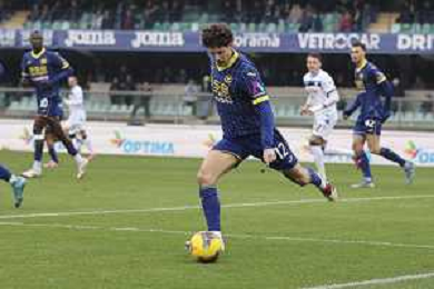 Lazar Samardzic of Atalanta BC play the ball during Hellas Verona FC vs Atalanta BC, 24° Serie A Enilive 2024-25 game at Marcantonio Bentegodi stadium in Verona (VR), Italy, on February 08, 2025. (Photo by Davide Casentini) AG ALDO LIVERANI SAS