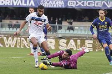 Lorenzo Montipò of Hellas Verona FC makes a save on Isak Hien of Atalanta BC during Hellas Verona FC vs Atalanta BC, 24° Serie A Enilive 2024-25 game at Marcantonio Bentegodi stadium in Verona (VR), Italy, on February 08, 2025. (Photo by Davide Casentini) AG ALDO LIVERANI SAS