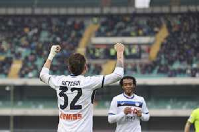Mateo Retegui of Atalanta BC celebrates after scoring second goal during Hellas Verona FC vs Atalanta BC, 24° Serie A Enilive 2024-25 game at Marcantonio Bentegodi stadium in Verona (VR), Italy, on February 08, 2025. (Photo by Davide Casentini) AG ALDO LIVERANI SAS