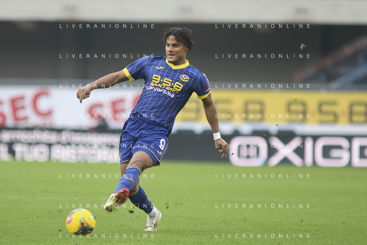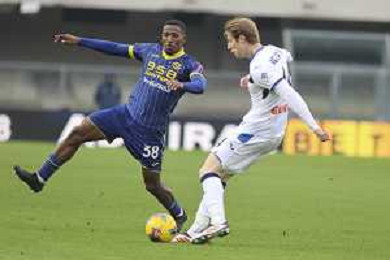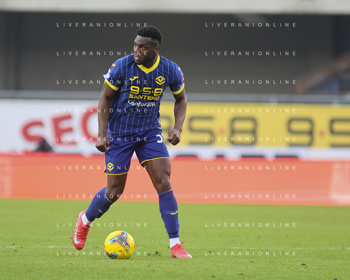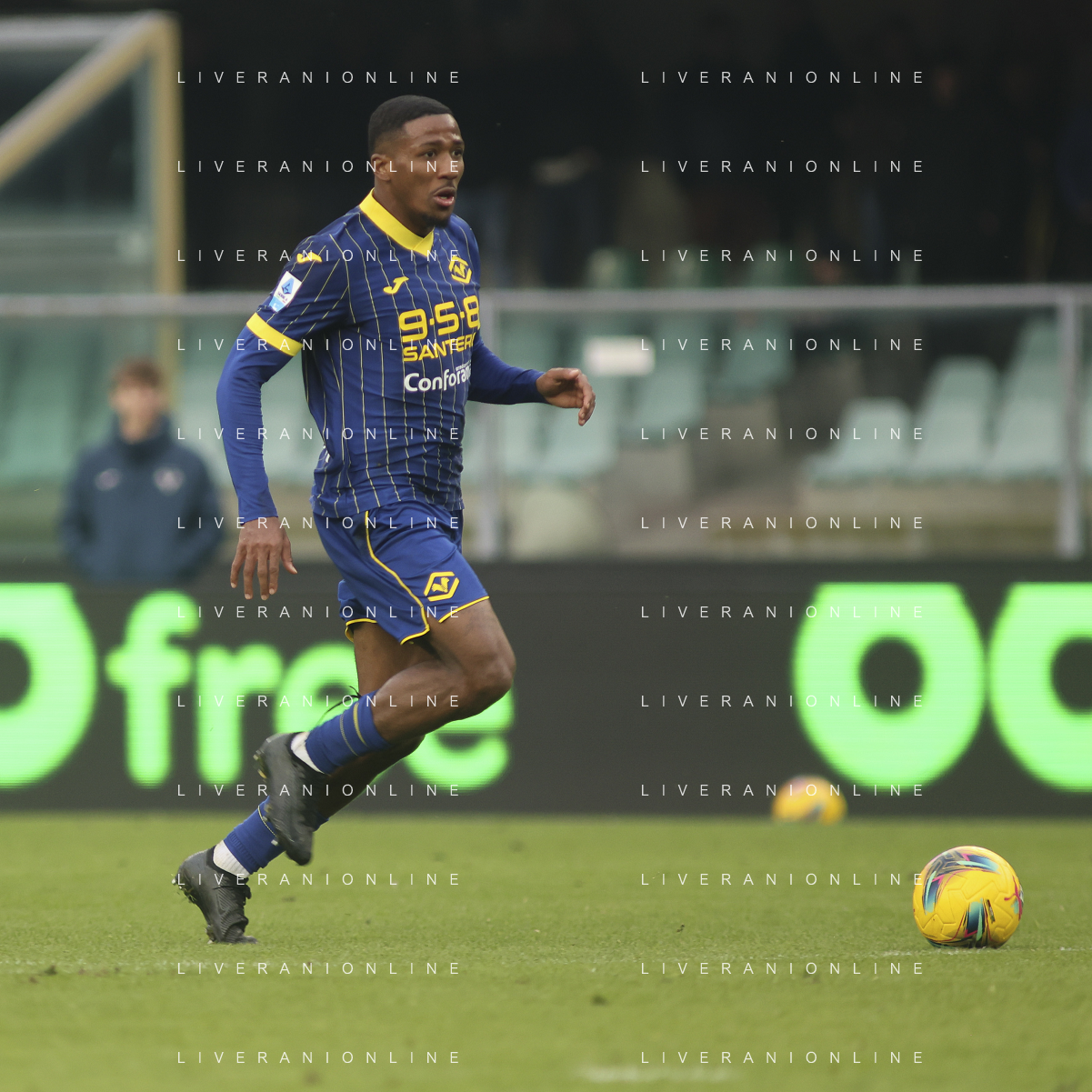 Amin Sarr of Hellas Verona FC play the ball during Hellas Verona FC vs Atalanta BC, 24° Serie A Enilive 2024-25 game at Marcantonio Bentegodi stadium in Verona (VR), Italy, on February 08, 2025. (Photo by Davide Casentini) AG ALDO LIVERANI SAS