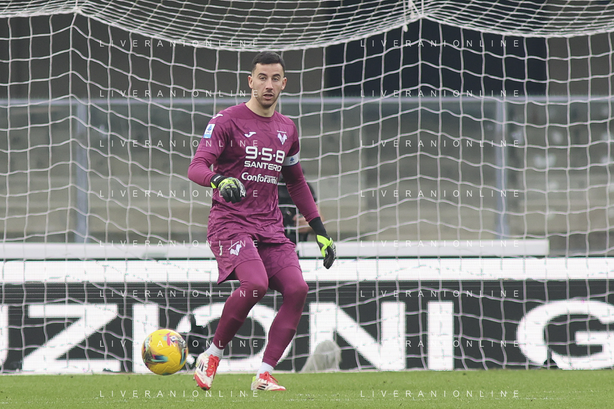 Lorenzo Montipò of Hellas Verona FC play the ball during Hellas Verona FC vs Atalanta BC, 24° Serie A Enilive 2024-25 game at Marcantonio Bentegodi stadium in Verona (VR), Italy, on February 08, 2025. (Photo by Davide Casentini) AG ALDO LIVERANI SAS