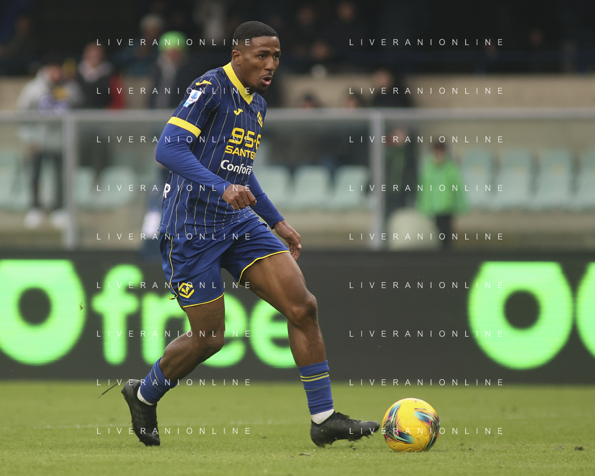 Jackson Tchatchoua of Hellas Verona FC play the ball during Hellas Verona FC vs Atalanta BC, 24° Serie A Enilive 2024-25 game at Marcantonio Bentegodi stadium in Verona (VR), Italy, on February 08, 2025. (Photo by Davide Casentini) AG ALDO LIVERANI SAS
