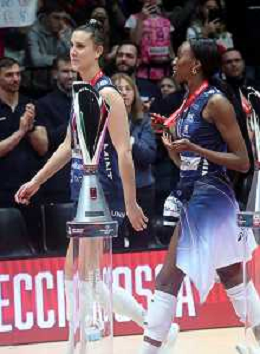 CASALECCHIO DI RENO (BOLOGNA) FINALI COPPA ITALIA FRECCIAROSSA FINALE PROSECCO DOC IMOCO CONEGLIANO-NUMIA VERO VOLLEY MILANO 3-0 NELLA FOTO PAOLA EGONU E ANNA DANESI DAVANTI LA COPPA PERSA DA CONEGLIANO FOTO GIANNI SANNA-AG ALDO LIVERANI SAS