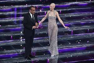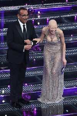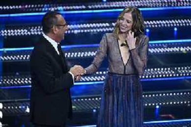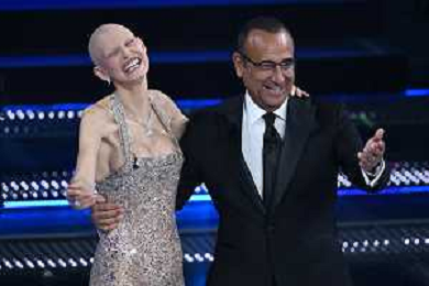 Festival Sanremo 2025 nella foto Bianca Balti e Carlo Conti 75mo Festival della Canzone Italiana - Seconda Serata Teatro Ariston - Sanremo (IM) 12-02-2025 foto Roberto Garavaglia/agenzia Aldo Liverani sas