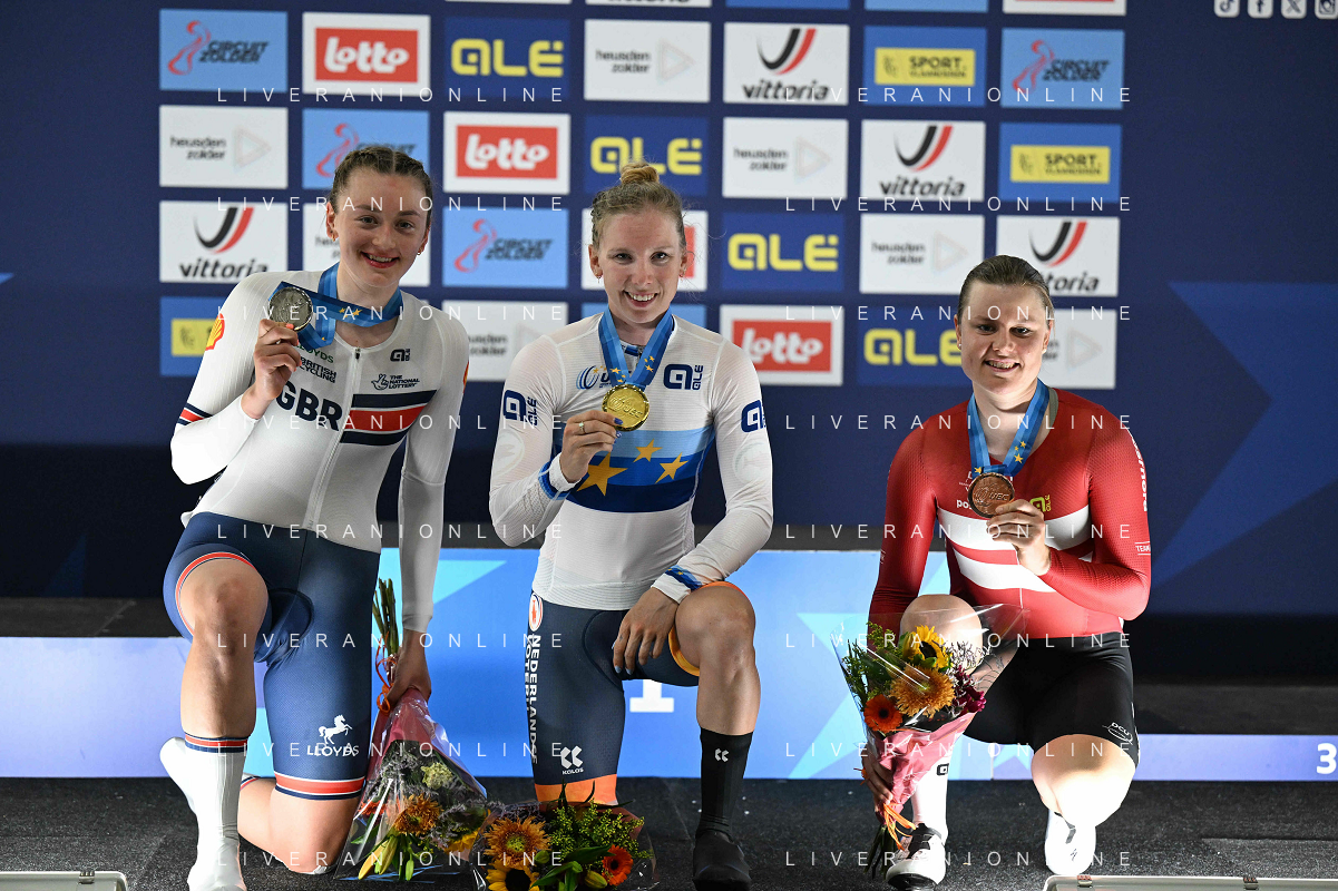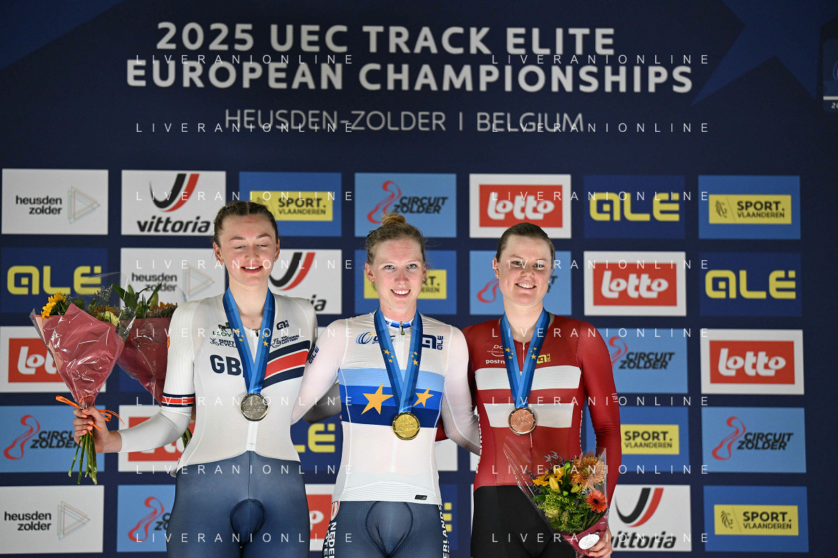 14-02-2025 European Championships Elite Women Track; Giornata 03; 2025, Olanda; 2025, Great Britain; 2025, Danimarca; Wiebes, Lorena; Leech, Madelaine; Dideriksen, Amalie; Zolder Velodromo; ©SIROTTI - AGENZIA ALDO LIVERANI SAS