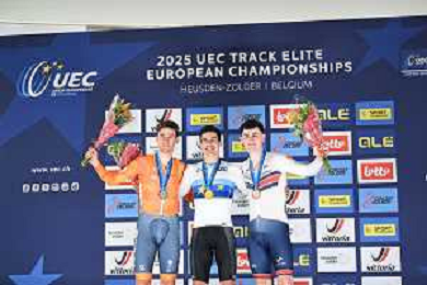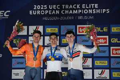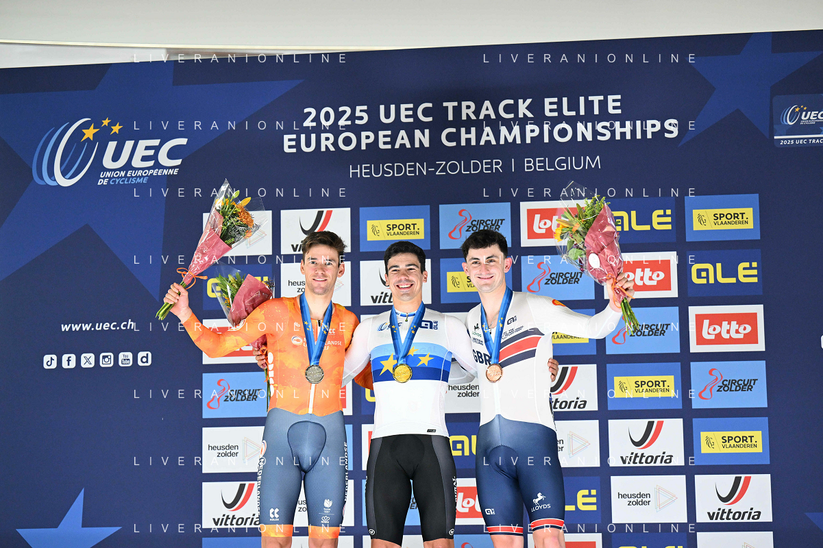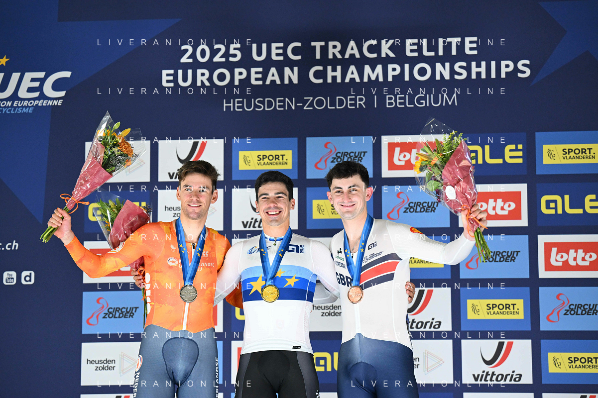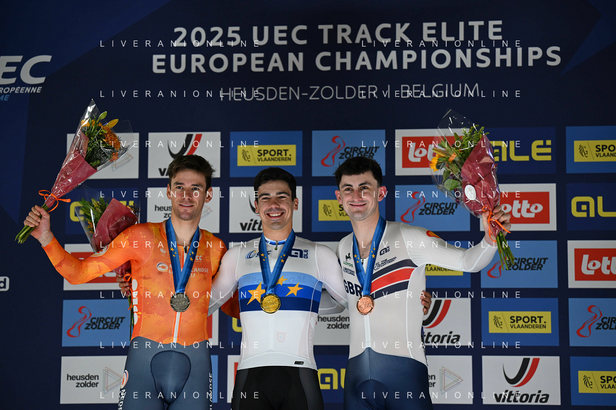 14-02-2025 European Championships Elite Track; Giornata 03; 2024, Portogallo; 2025, Olanda; 2025, Great Britain; Leitao, Iuri; Hoppezak, Vincent; Tidball, William; Zolder Velodromo; ©SIROTTI - AGENZIA ALDO LIVERANI SAS