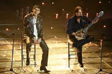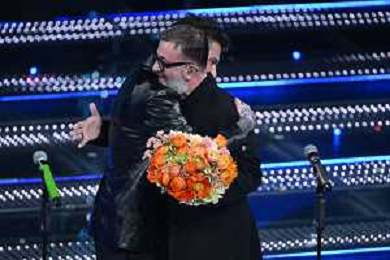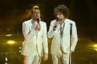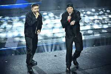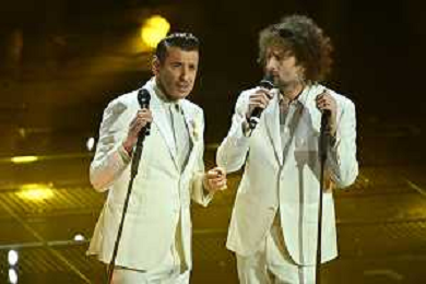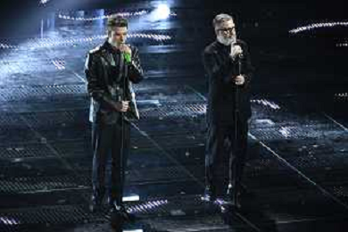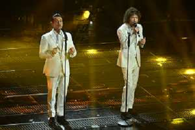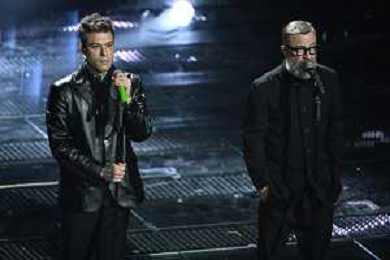 Festival Sanremo 2025 nella foto Fedez con Marco Masini 75mo Festival della Canzone Italiana - Quarta Serata Teatro Ariston - Sanremo (IM) 14-02-2025 foto Roberto Garavaglia/agenzia Aldo Liverani sas