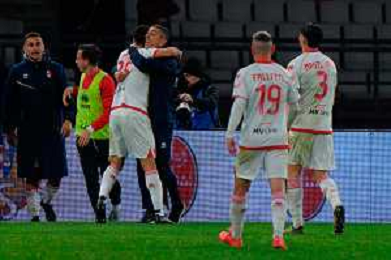 TVEM February 15, 2025 Bari, Italy - SSC Bari vs US Cremonese - Italian soccer serie B 2024/25 - San Nicola Stadium. In the pic: Raffaele Pucino of SSC Bari celebrates with coach Moreno Longo of SSC Bari foto emmanuele mastodonato-ag aldo liverani sas