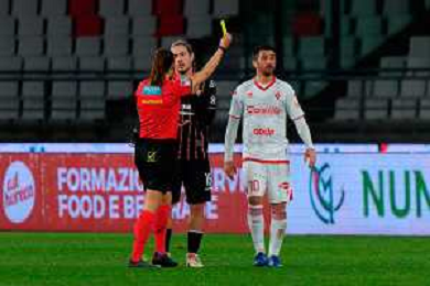 TVEM February 15, 2025 Bari, Italy - SSC Bari vs US Cremonese - Italian soccer serie B 2024/25 - San Nicola Stadium. In the pic: Nicola Bellomo of SSC Bari receives a yellow card foto emmanuele mastodonato-ag aldo liverani sas
