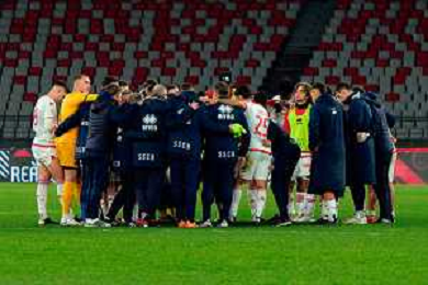 TVEM February 15, 2025 Bari, Italy - SSC Bari vs US Cremonese - Italian soccer serie B 2024/25 - San Nicola Stadium. In the pic: The SSC Bari players hug each other foto emmanuele mastrodonato-ag aldo liverani sas
