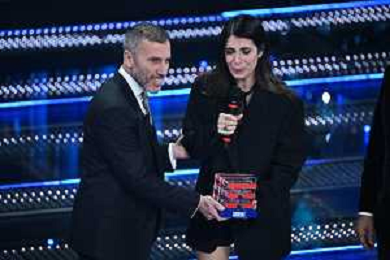 Festival Sanremo 2025 nella foto Giorgia vince il premio TIM per l'artista più votato su app, siti e canali social ufficiali TIM, a SX Pietro Labiola amministratore delegato TIM 75mo Festival della Canzone Italiana - Quinta Serata Teatro Ariston - Sanremo (IM) 15-02-2025 foto Roberto Garavaglia/agenzia Aldo Liverani sas