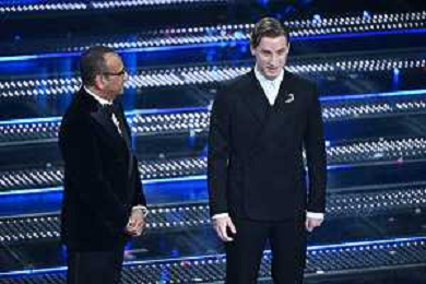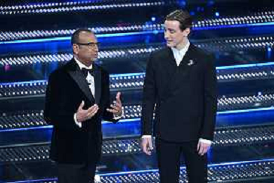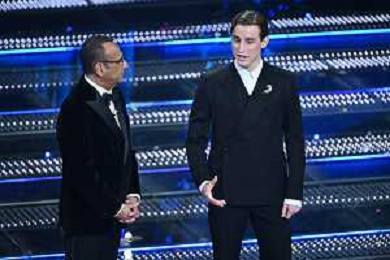 Festival Sanremo 2025 nella foto Edoardo Bove (Fiorentina) e Carlo Conti 75mo Festival della Canzone Italiana - Quinta Serata Teatro Ariston - Sanremo (IM) 15-02-2025 foto Roberto Garavaglia/agenzia Aldo Liverani sas