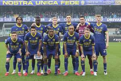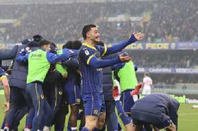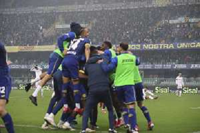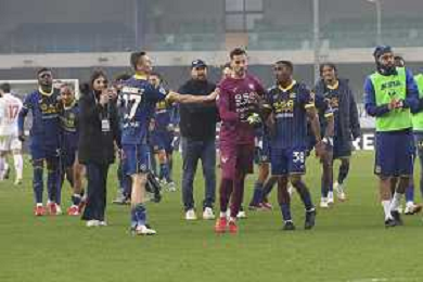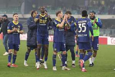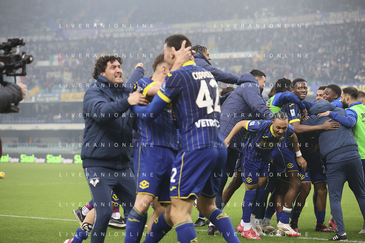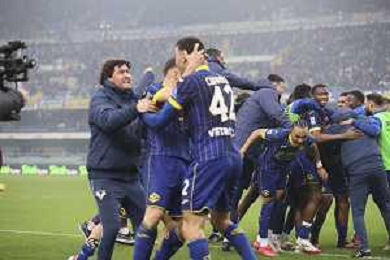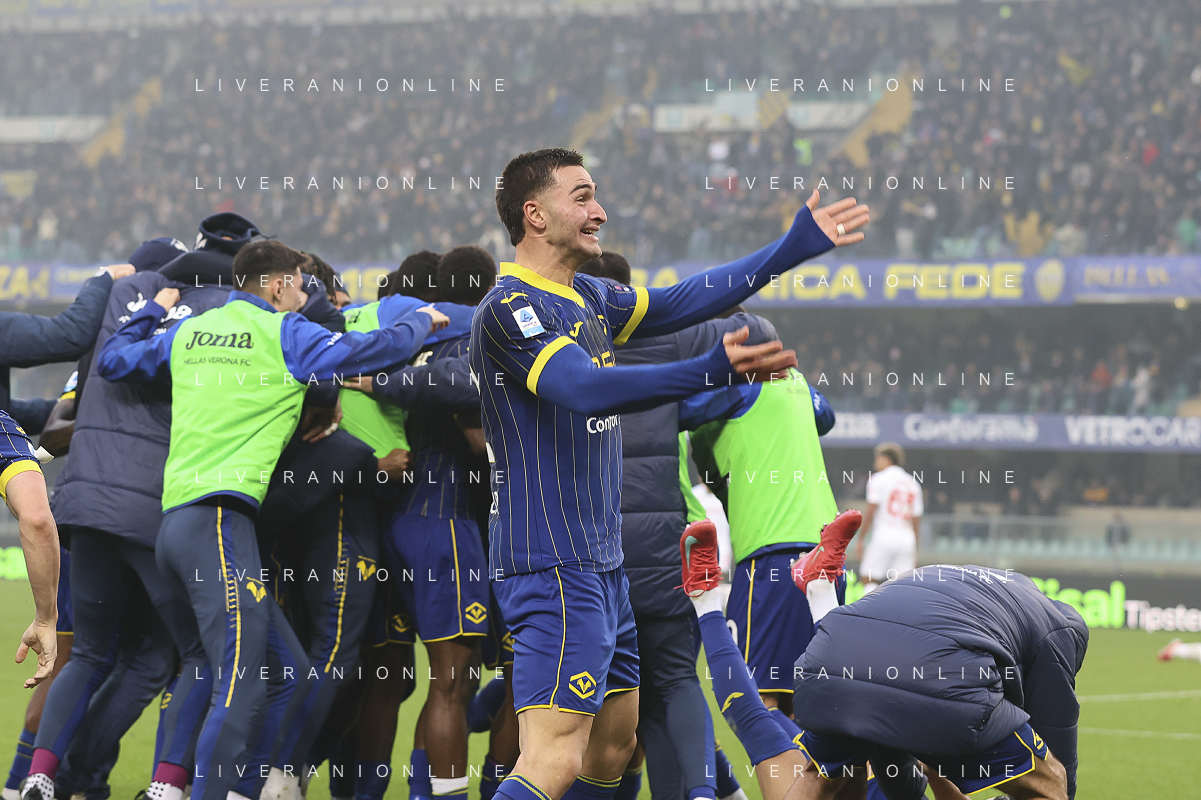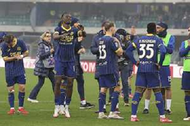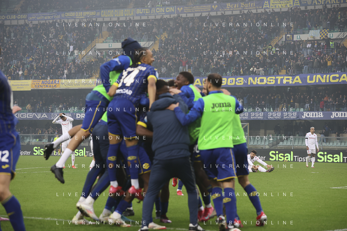 Hellas Verona players celebrate the victory at the end of Hellas Verona FC vs ACF Fiorentina, 26° Serie A Enilive 2024-25 game at Marcantonio Bentegodi stadium in Verona (VR), Italy, on February 23, 2025. (Photo by Davide Casentini)- AGENZIA ALDO LIVERANI SAS