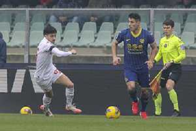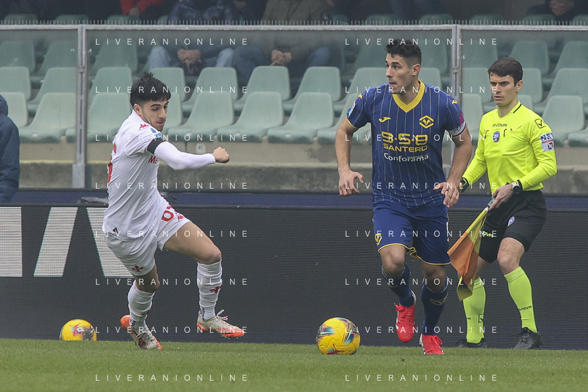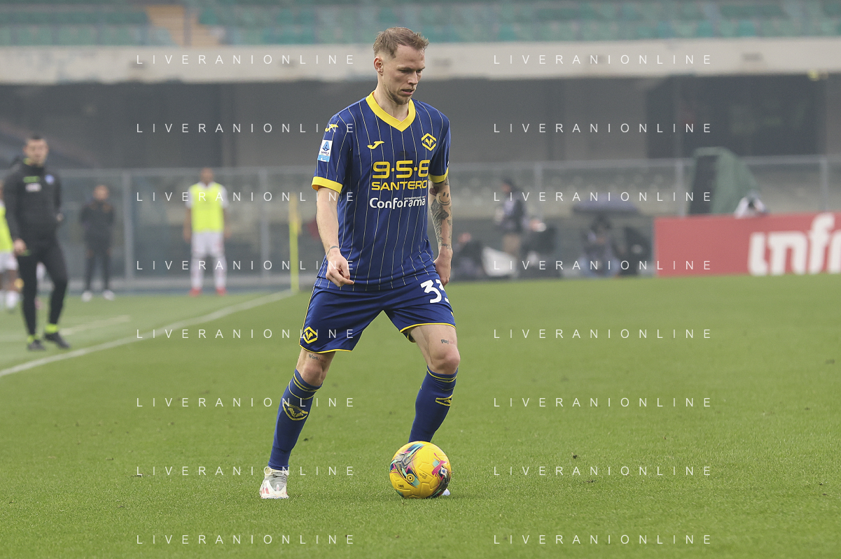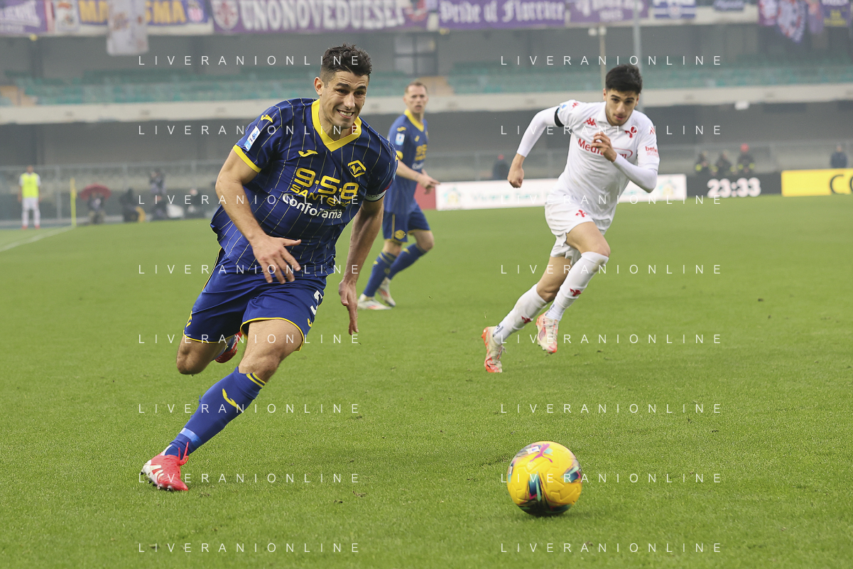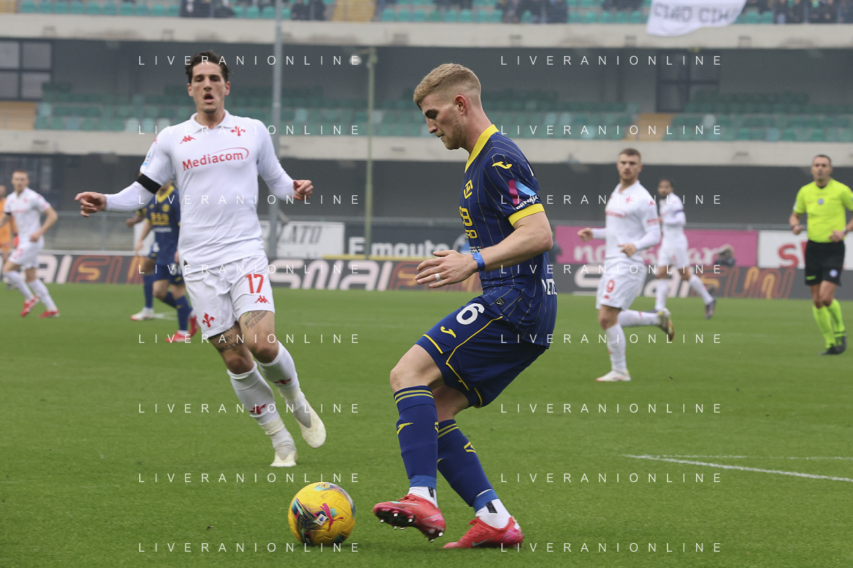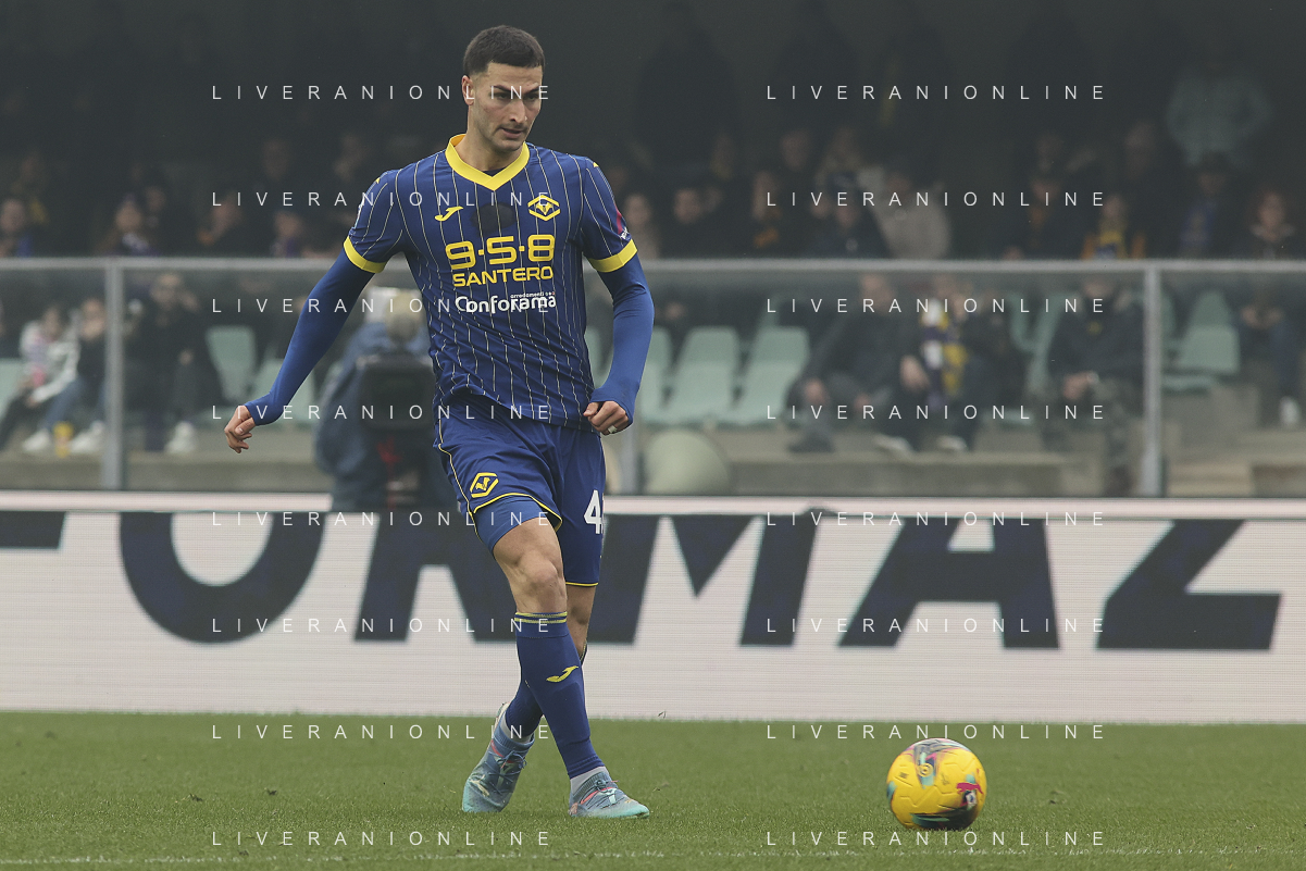 Diego Coppola of Hellas Verona FC play the ball during Hellas Verona FC vs ACF Fiorentina, 26° Serie A Enilive 2024-25 game at Marcantonio Bentegodi stadium in Verona (VR), Italy, on February 23, 2025. (Photo by Davide Casentini)- AGENZIA ALDO LIVERANI SAS