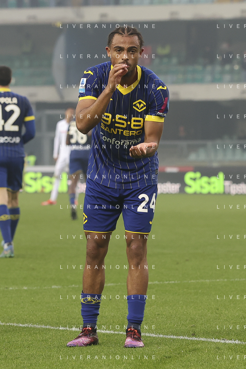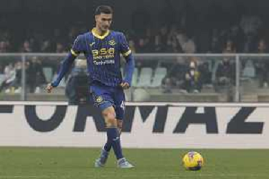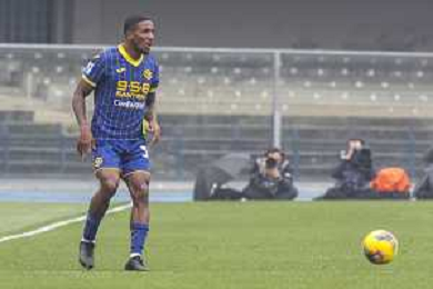 Jackson Tchatchoua of Hellas Verona FC play the ball during Hellas Verona FC vs ACF Fiorentina, 26° Serie A Enilive 2024-25 game at Marcantonio Bentegodi stadium in Verona (VR), Italy, on February 23, 2025. (Photo by Davide Casentini)- AGENZIA ALDO LIVERANI SAS