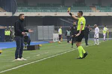 arbitro con cartellino giallo - Referee Marco di Bello shows the yellow card to Paolo Zanetti Head Coach of Hellas Verona FC during Hellas Verona FC vs ACF Fiorentina, 26° Serie A Enilive 2024-25 game at Marcantonio Bentegodi stadium in Verona (VR), Italy, on February 23, 2025. (Photo by Davide Casentini)- AGENZIA ALDO LIVERANI SAS