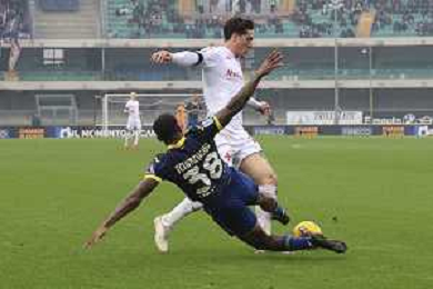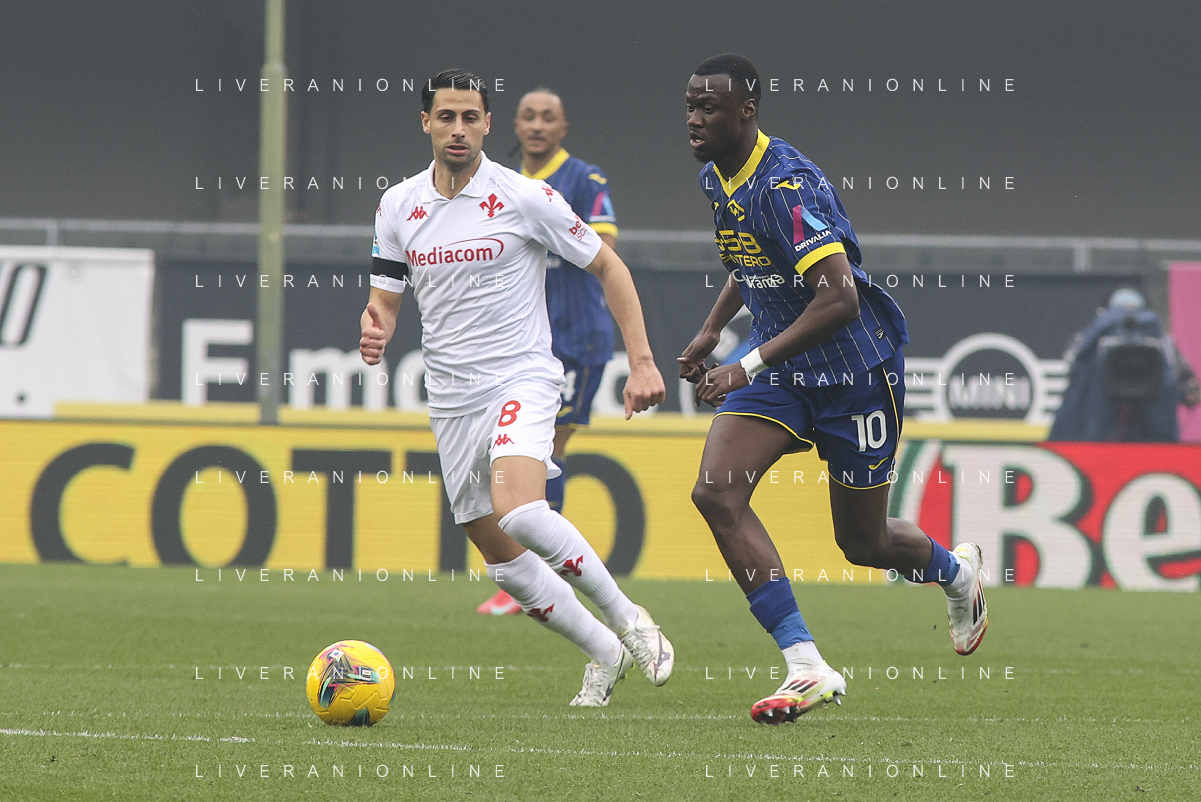 Jackson Tchatchoua of Hellas Verona FC battle for the ball with Nicolò Zaniolo of ACF Fiorentina during Hellas Verona FC vs ACF Fiorentina, 26° Serie A Enilive 2024-25 game at Marcantonio Bentegodi stadium in Verona (VR), Italy, on February 23, 2025. (Photo by Davide Casentini)- AGENZIA ALDO LIVERANI SAS