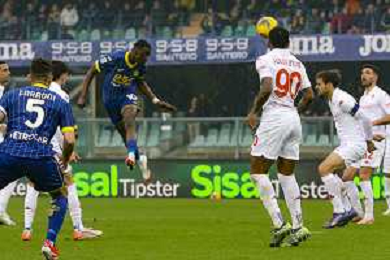 Cheikh Niasse of Hellas Verona FC heads the ball during Hellas Verona FC vs ACF Fiorentina, 26° Serie A Enilive 2024-25 game at Marcantonio Bentegodi stadium in Verona (VR), Italy, on February 23, 2025. (Photo by Davide Casentini)- AGENZIA ALDO LIVERANI SAS