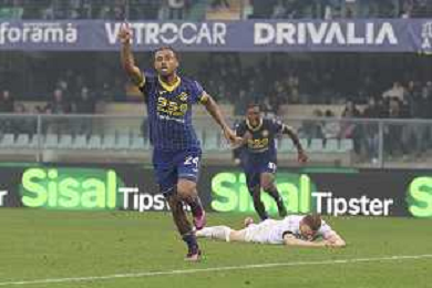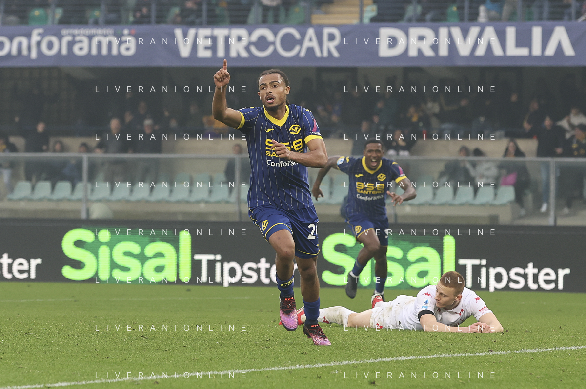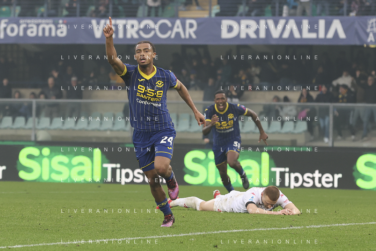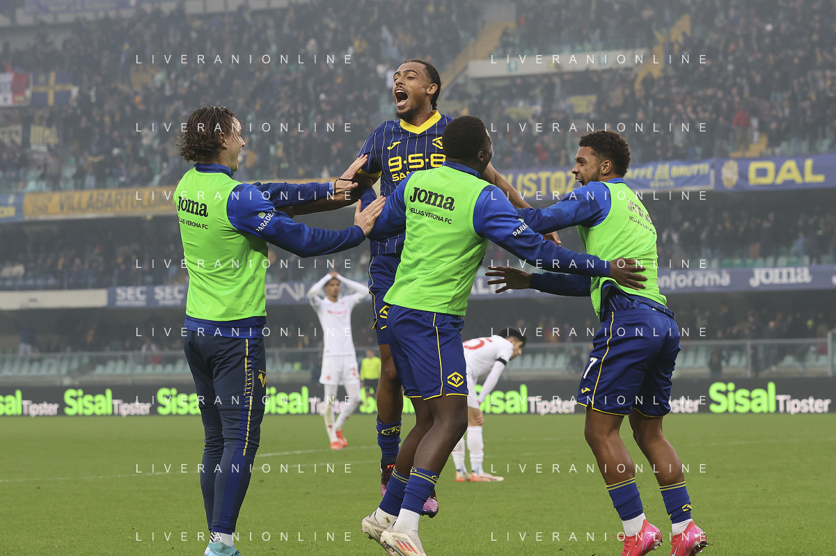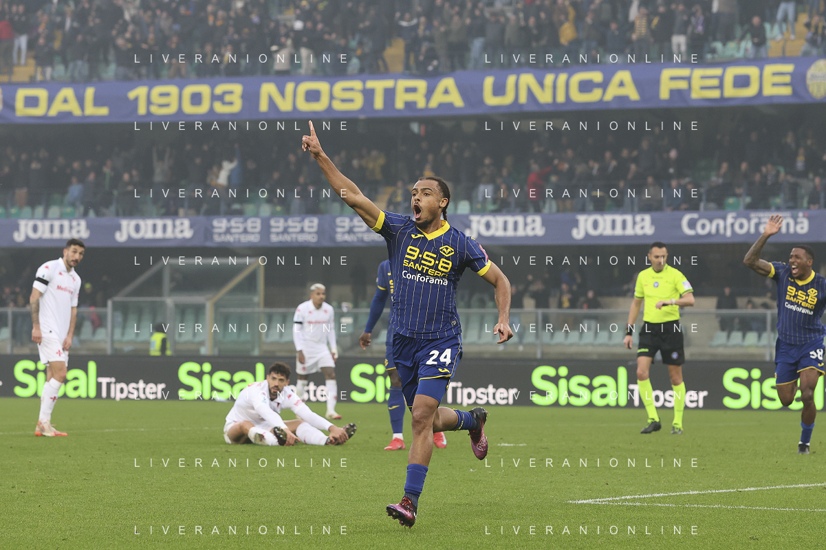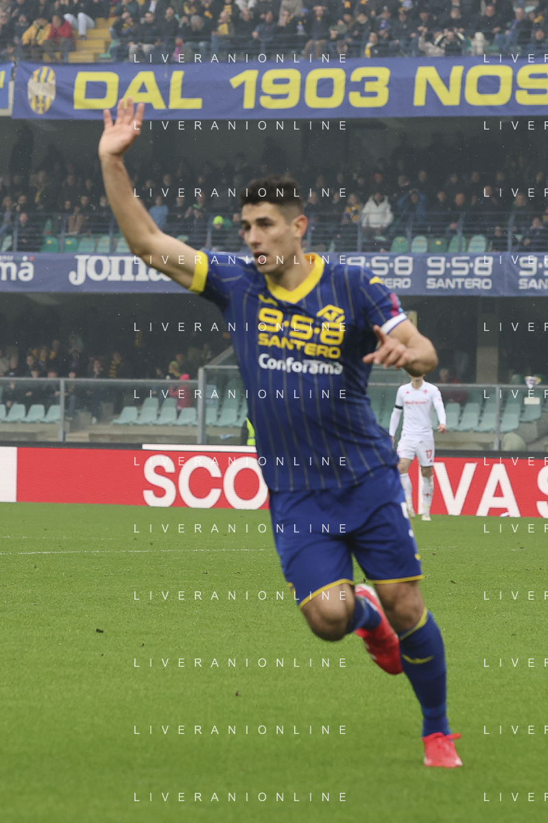 Antoine Bernede of Hellas Verona FC scores a goal during Hellas Verona FC vs ACF Fiorentina, 26° Serie A Enilive 2024-25 game at Marcantonio Bentegodi stadium in Verona (VR), Italy, on February 23, 2025. (Photo by Davide Casentini)- AGENZIA ALDO LIVERANI SAS