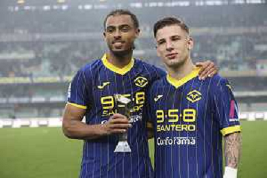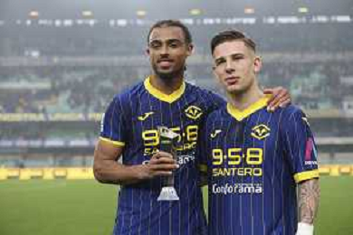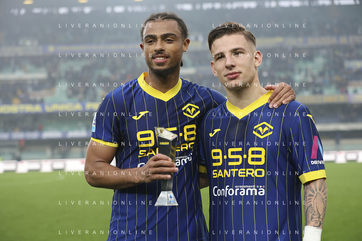 Antoine Bernede of Hellas Verona FC and Tomas Suslov of Hellas Verona FC during Hellas Verona FC vs ACF Fiorentina, 26° Serie A Enilive 2024-25 game at Marcantonio Bentegodi stadium in Verona (VR), Italy, on February 23, 2025. (Photo by Davide Casentini)- AGENZIA ALDO LIVERANI SAS