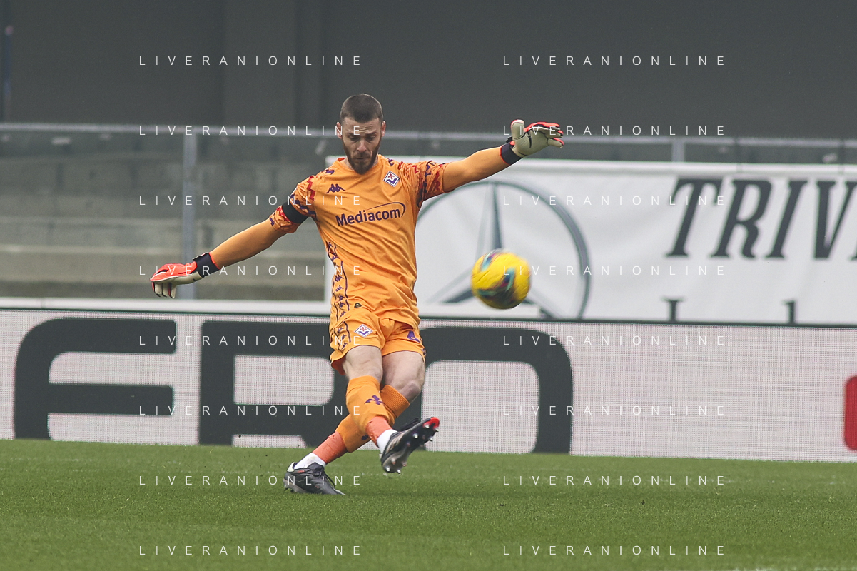 David De Gea Quintana of ACF Fiorentina kick the ball during Hellas Verona FC vs ACF Fiorentina, 26° Serie A Enilive 2024-25 game at Marcantonio Bentegodi stadium in Verona (VR), Italy, on February 23, 2025. (Photo by Davide Casentini)- AGENZIA ALDO LIVERANI SAS
