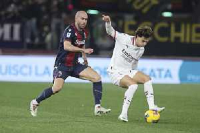 Joao Felix of AC Milan battle for the ball with Lorenzo De Silvestri of Bologna FC during Bologna BFC vs AC Milan, 9° Serie A Enilive 2024-25 game at Renato Dall'Ara stadium in Bologna (BO), Italy, on February 27, 2025. (Photo by Davide Casentini)- AGENZIA ALDO LIVERANI SAS