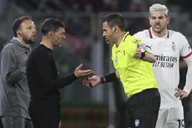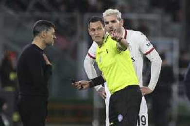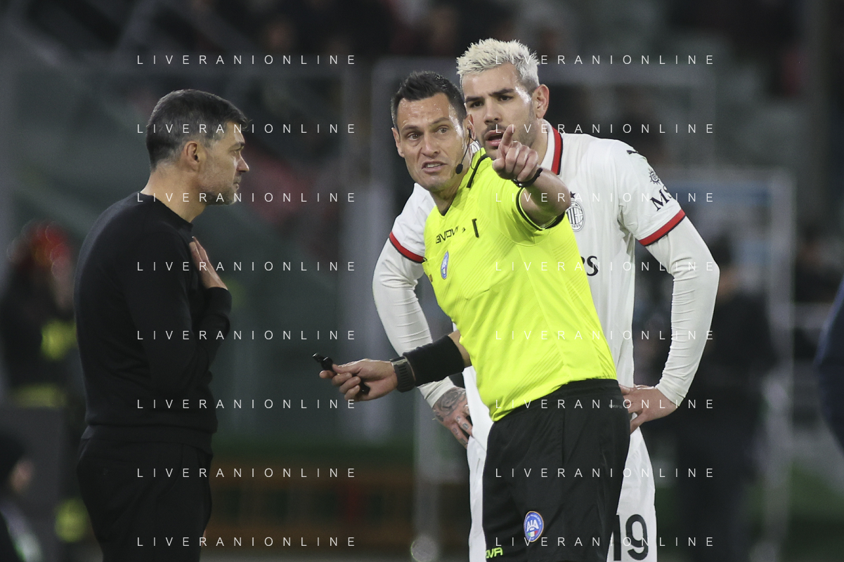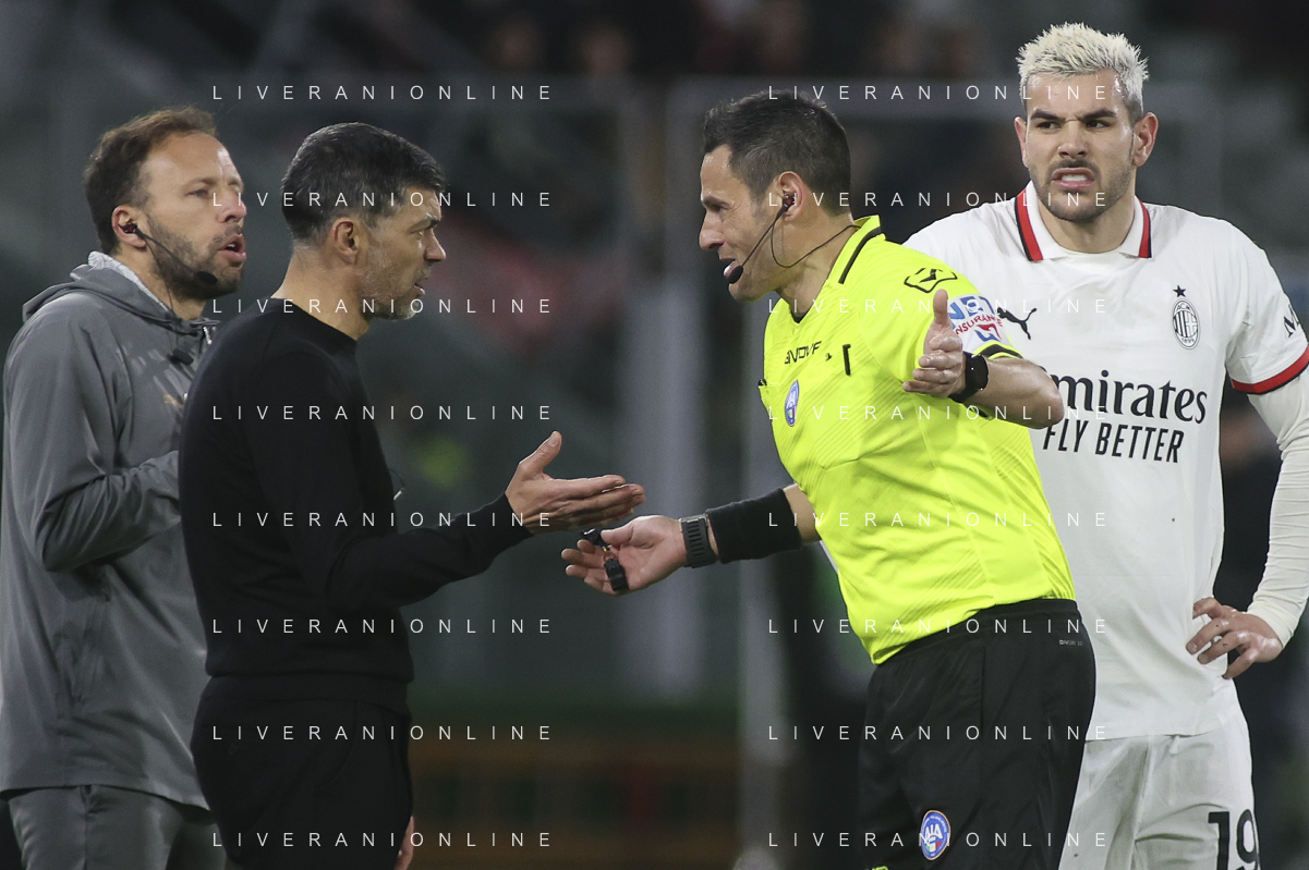 arbitro - the Referee Maurizio Mariani speaks to Sergio Conceicao Head Coach of AC Milan during Bologna BFC vs AC Milan, 9° Serie A Enilive 2024-25 game at Renato Dall'Ara stadium in Bologna (BO), Italy, on February 27, 2025. (Photo by Davide Casentini)- AGENZIA ALDO LIVERANI SAS