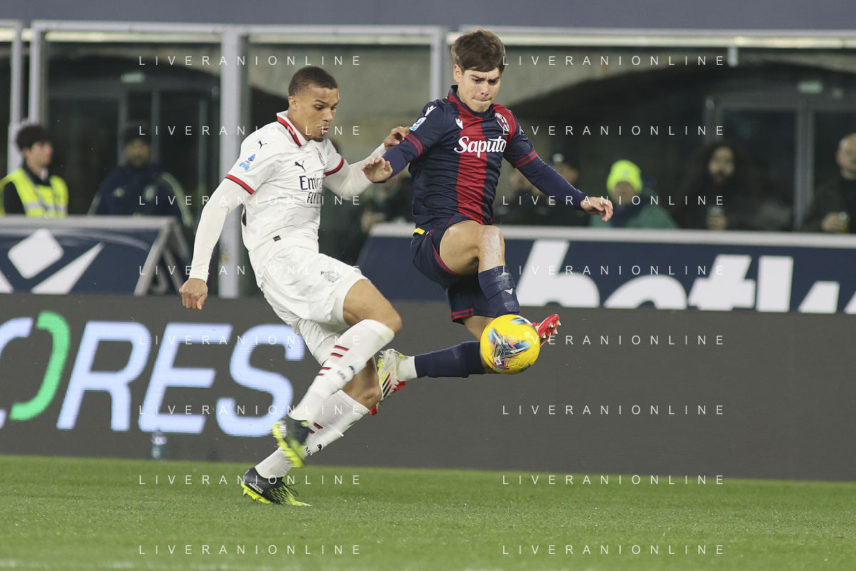 Benjamin Dominguez of Bologna FC battle for the ball with Malick Thiaw of AC Milan during Bologna BFC vs AC Milan, 9° Serie A Enilive 2024-25 game at Renato Dall'Ara stadium in Bologna (BO), Italy, on February 27, 2025. (Photo by Davide Casentini)- AGENZIA ALDO LIVERANI SAS