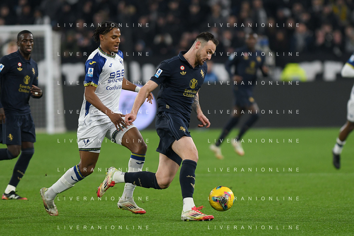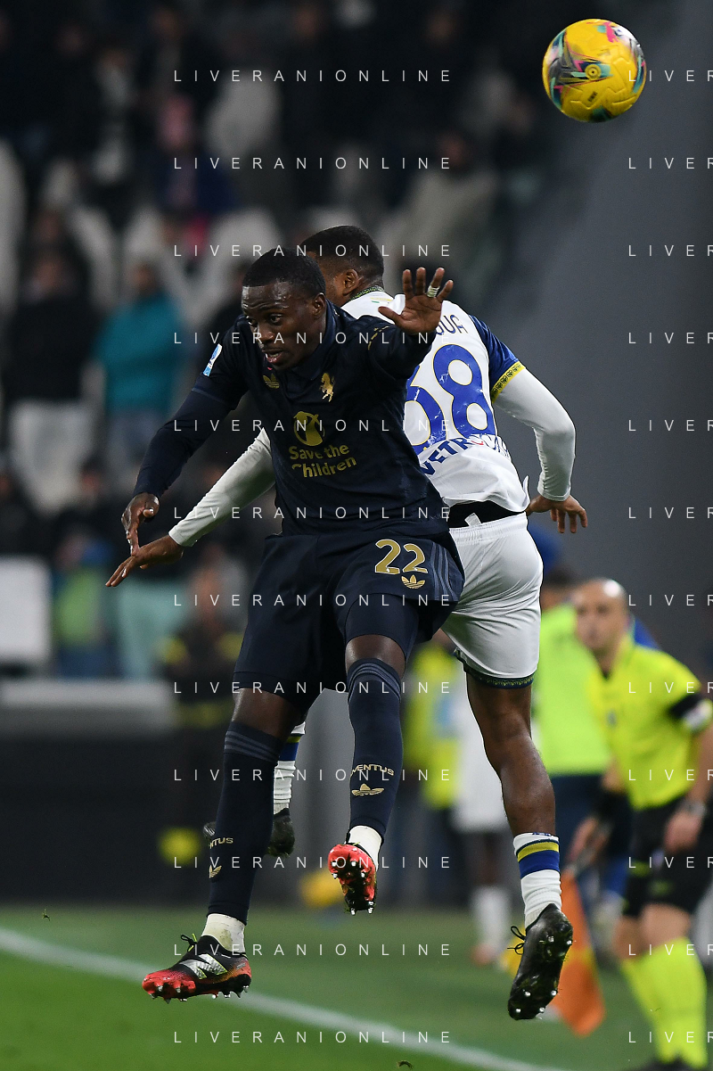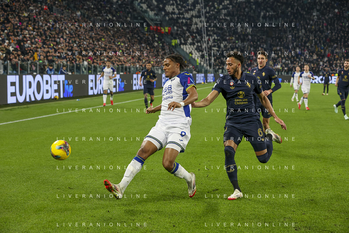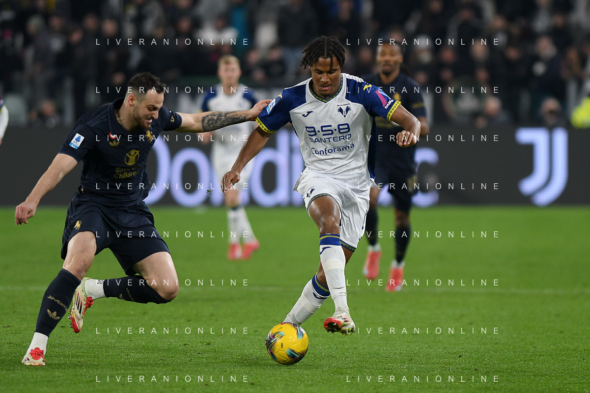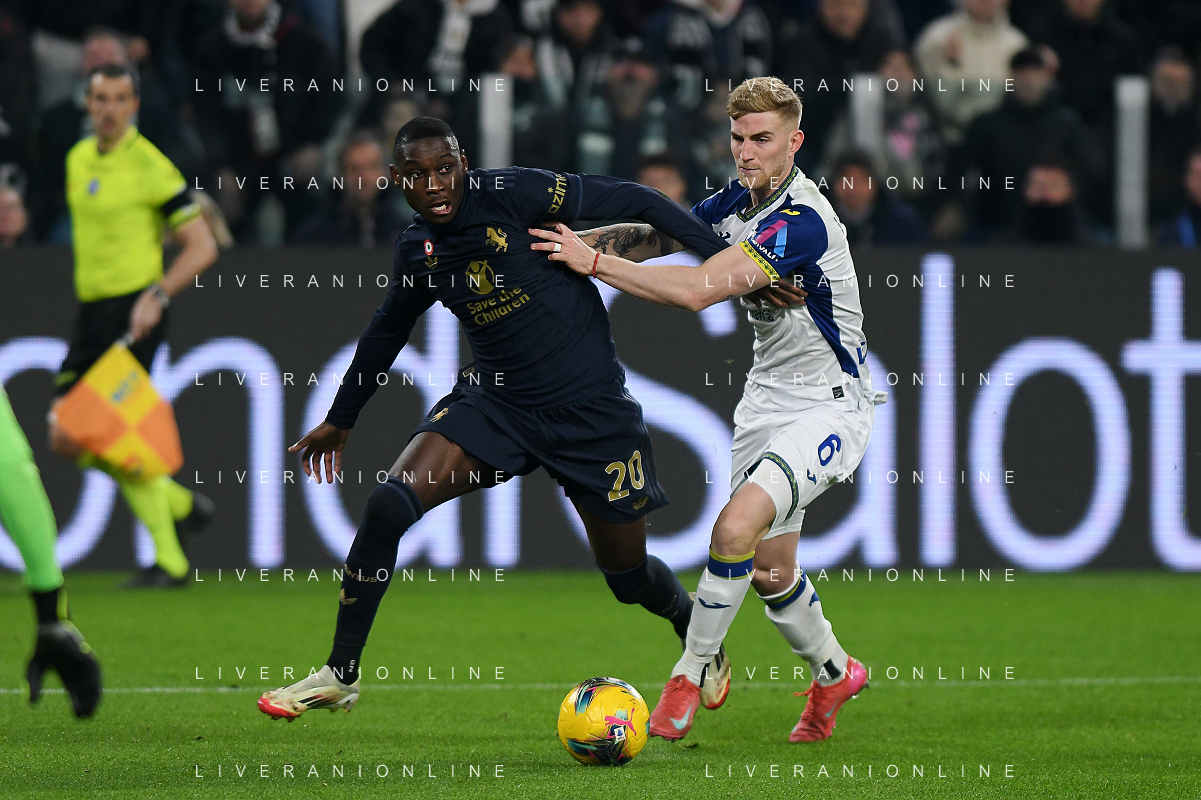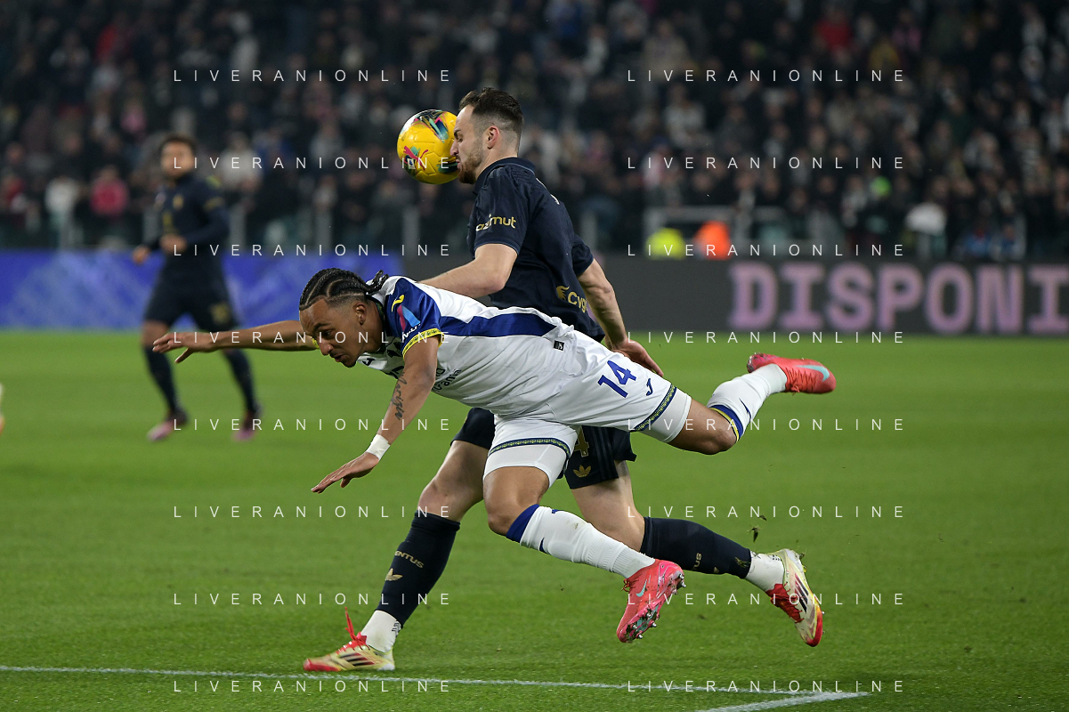 Amin Sarr of Hellas Verona FC competes for the ball with Lloyd Kelly of Juventus FC during Juventus FC vs Hellas Verona FC, 27° Serie A Enilive 2024-25 game at Allianz Stadium in Torino (TO), Italy, on March 03, 2025. (Photo by Davide Casentini) - AG ALDO LIVERANI SAS